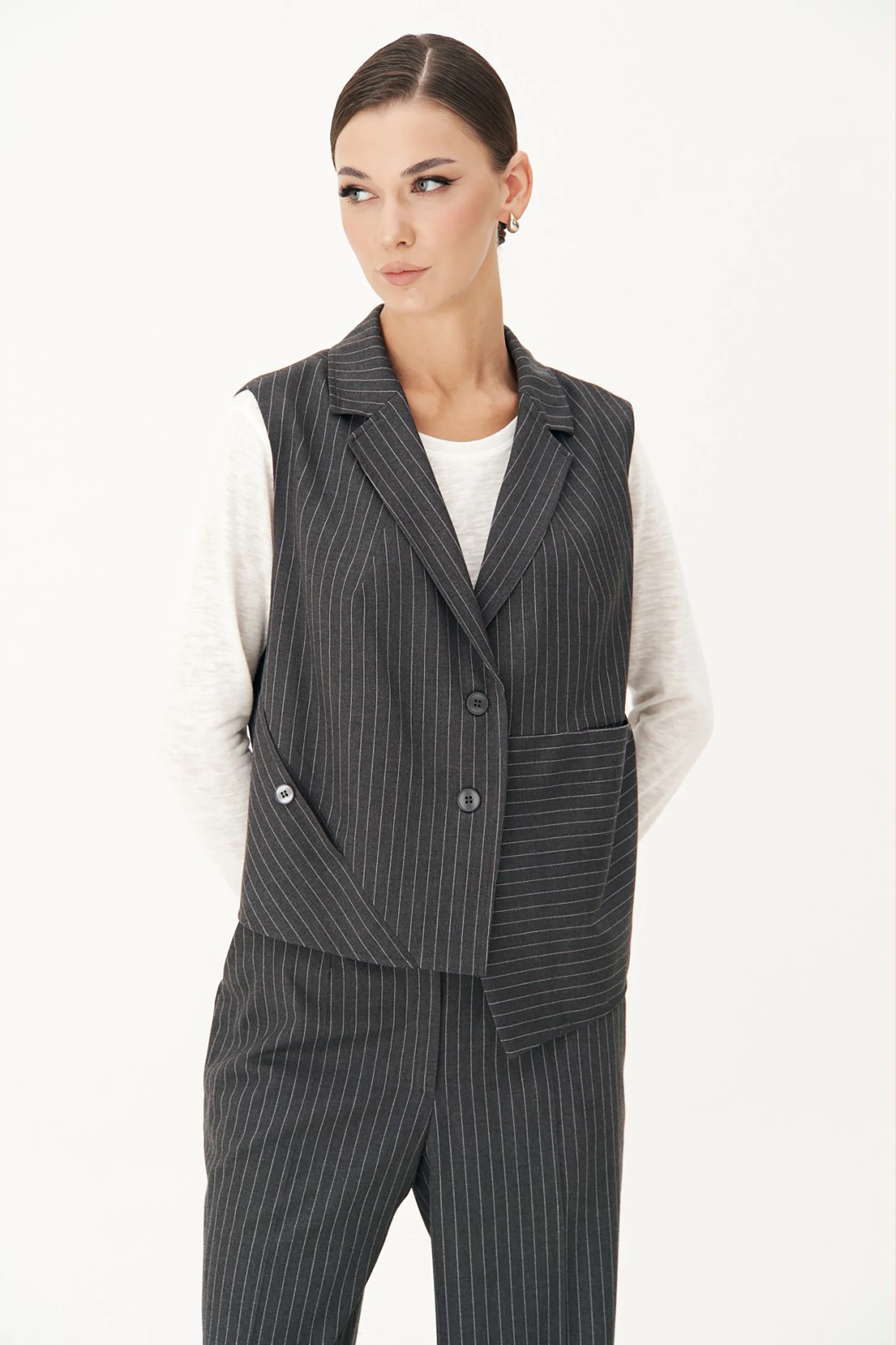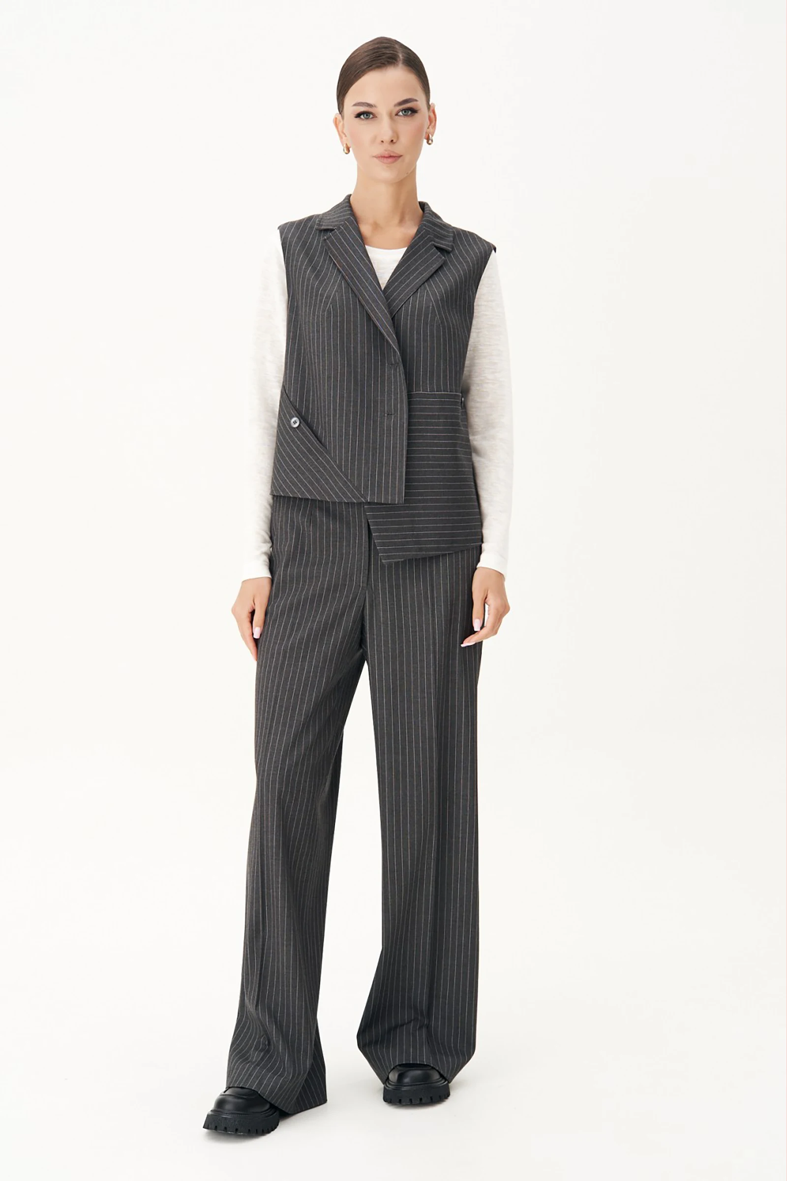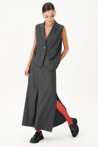 Костюм с жилетом - прекрасное решение для смелых экспериментов. Выполненный в ахроматической цветовой гамме, он позволяет дополнять себя различными аксессуарами и создавать каждый раз новые актуальные образы. Жилет прямого силуэта с центральной застёжкой и фигурным разноуровневым бортом. Спинка с декоративной разноуровневой планкой, которая имитирует застежку. Брюки классические со стрелками в мужском стиле. По передним половинкам мягкая складка и боковой наклонный карман, по задним - прорезные листочки. Пояс с притачными шлёвками, застёгивающийся на потайные крючки.