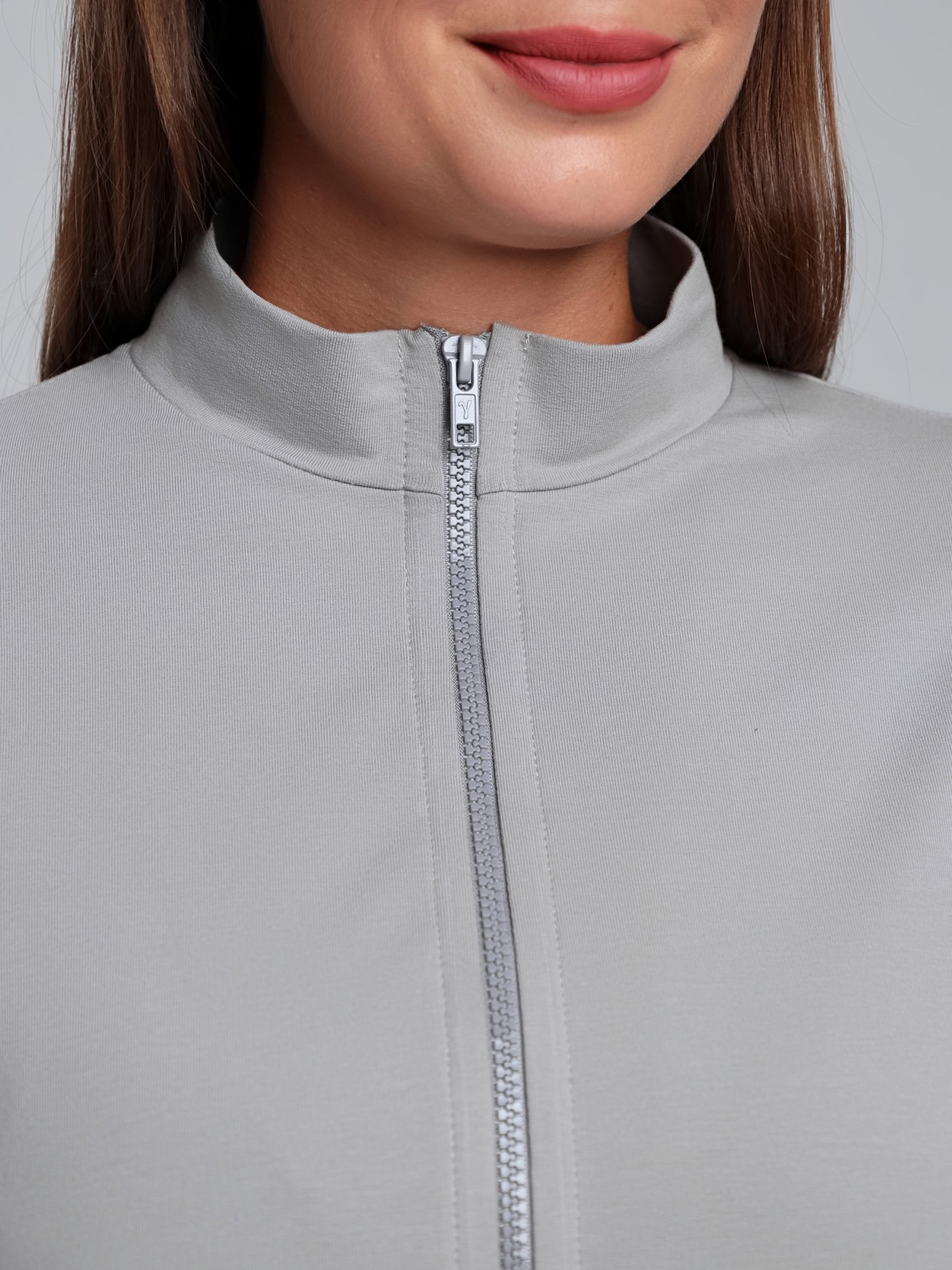 Костюм женский из трикотажного полотна «футер-двунитка» в единой цветовой гамме, состоящий из куртки и брюк. Куртка - прямого силуэта, свободная с длинными втачными рукавами, воротником «стойкой». Полочка состоит из двух частей соединенных по-косой, с накладными карманами и центральной бортовой застежкой на тесьму «молния». Низ рукавов обработан эластичной тесьмой, низ изделия с подгибкой с вложение эластичной тесьмы и регулируется по длине с помощью фиксаторов.Брюки - длинные, классического покроя, на притачном поясе с эластичной тесьмой внутри и карманами в боковых шва, на задних половинах обработаны две вытачки в области линии талии.