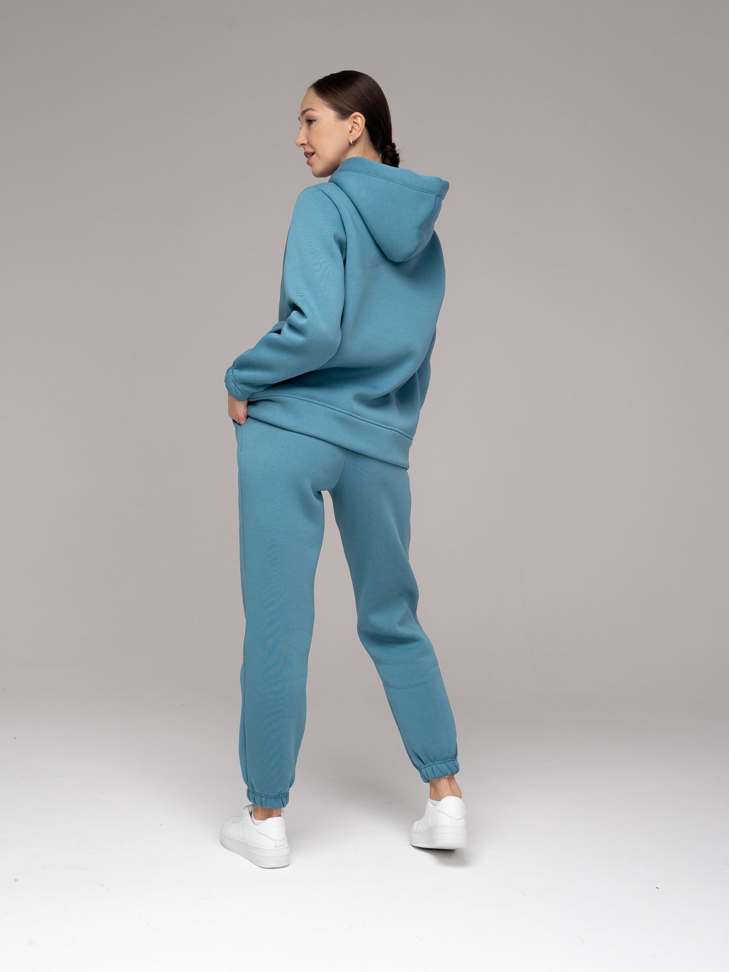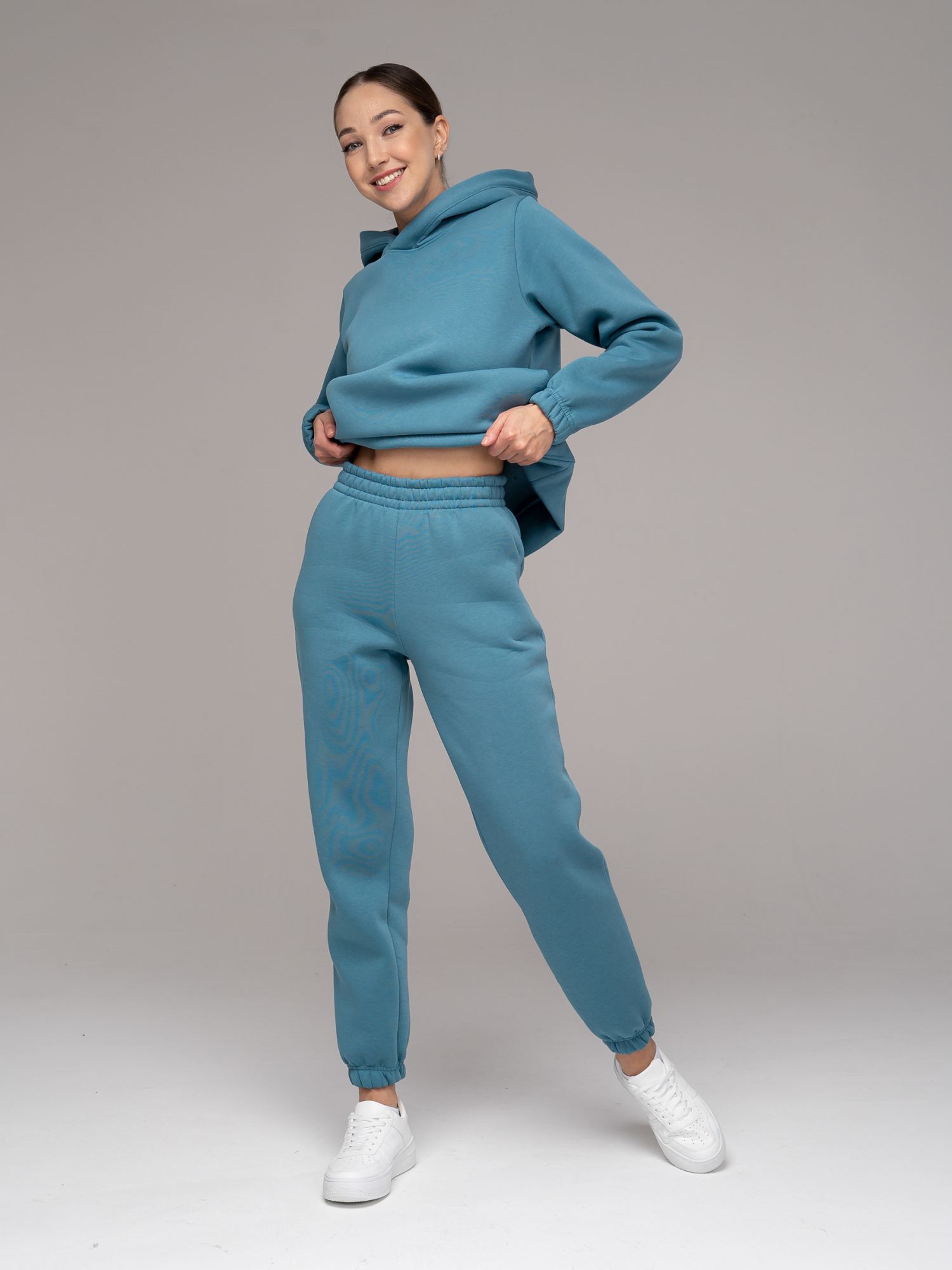 Женский костюм-двойка из футера с начесом Блюстоун цвета в стиле "оверсайз". Толстовка свободного силуэта с капюшоном и длинными рукавами. Карманы в боковых швах. Капюшон объемный двойной. По низу рукавов - резинка, низ изделия на поясе из основного полотна. Брюки с широким цельнокроенным поясом и боковыми карманами. По низу брюк - резинка. Изделие выполнено из трикотажа премиального качества - ПЕНЬЕ, с содержанием хлопка более 80%