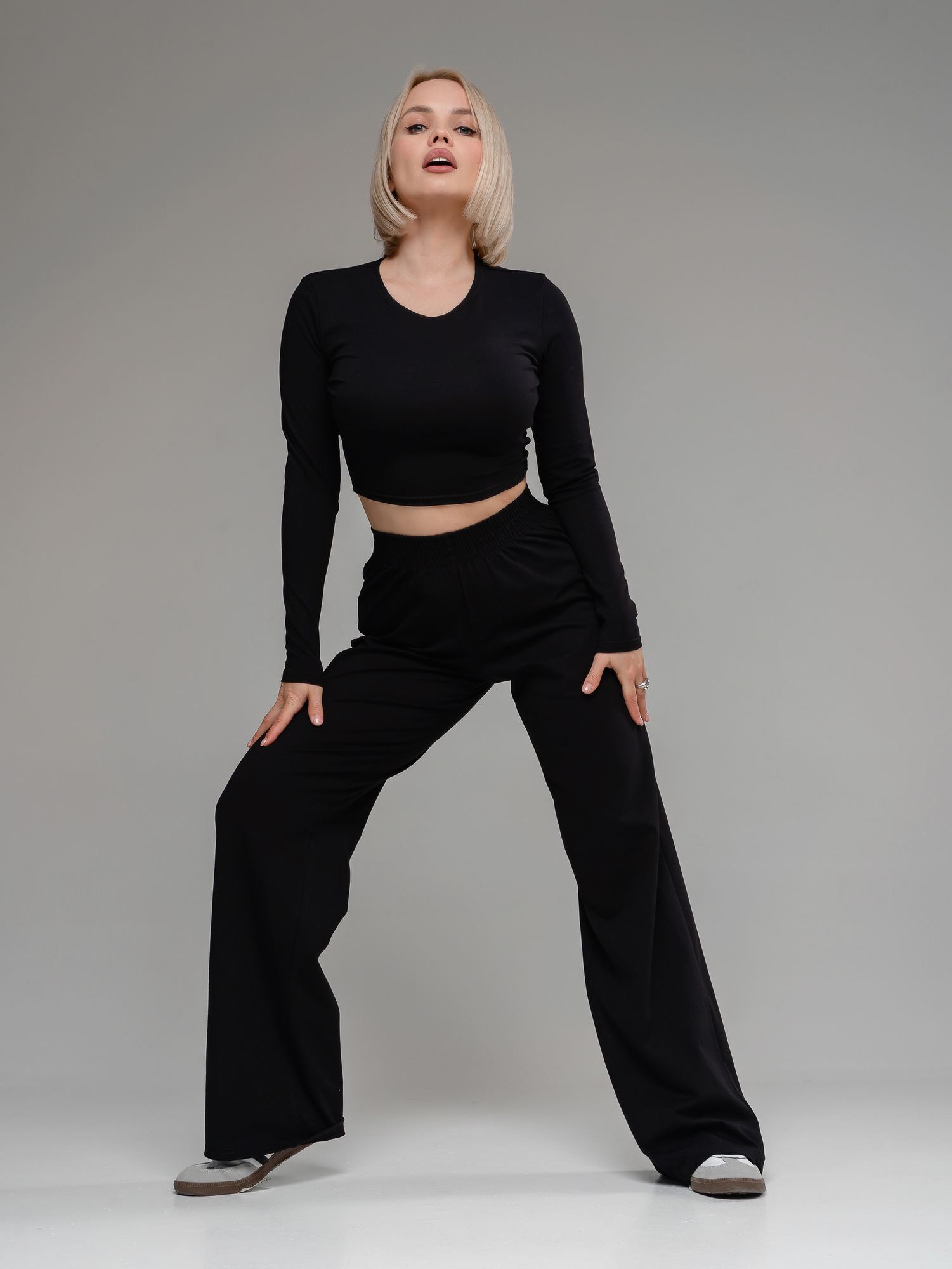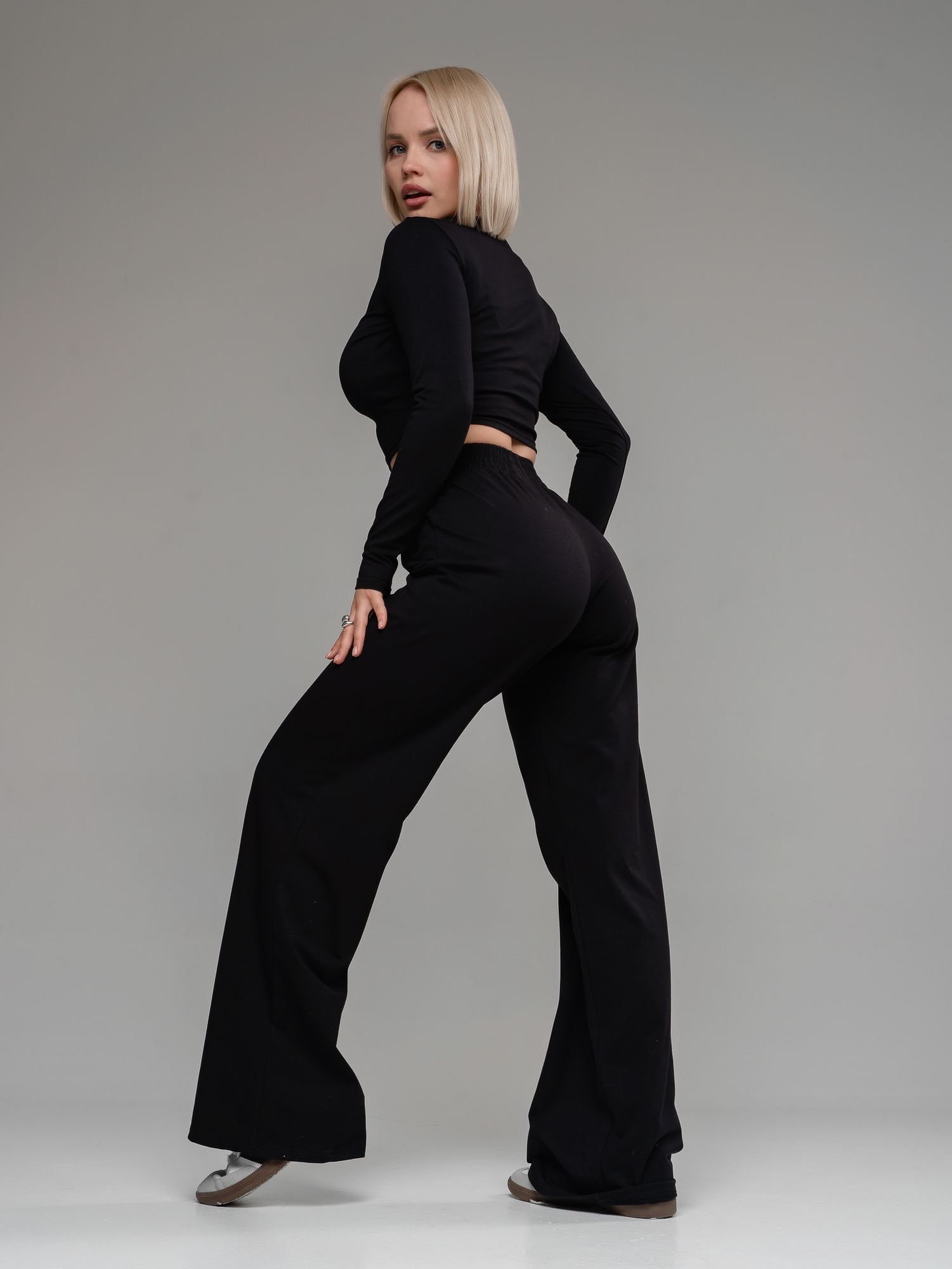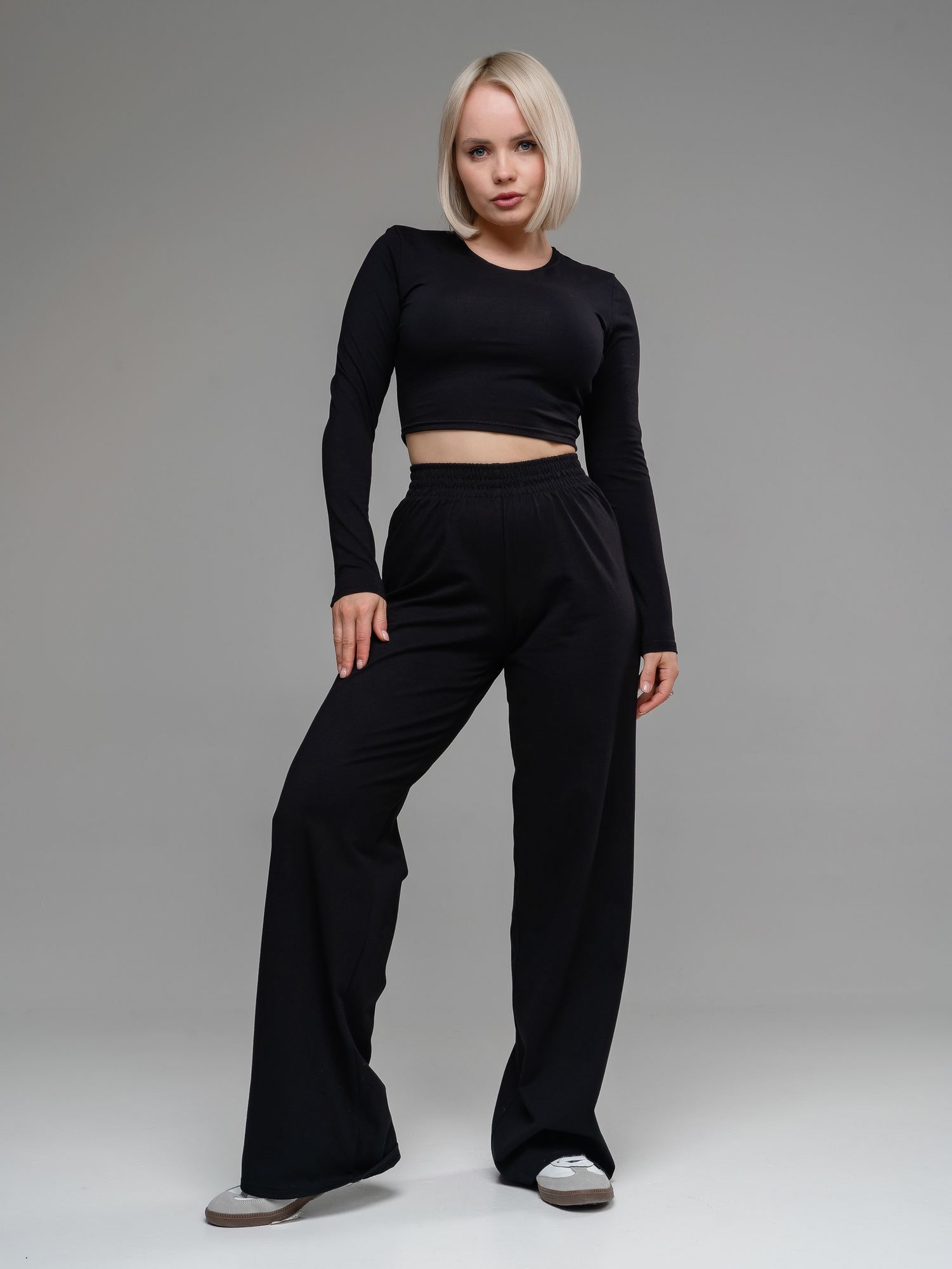Оригинальный костюм-двойка из кулирки черного цвета . Укороченный кроп с длинными прямыми рукавами и округлой горловиной. Расширенные брюки прямого силуэта с широким цельнокроенным поясом на резинке. Изделие выполнено из трикотажа премиального качества - ПЕНЬЕ, с содержанием хлопка более 95%