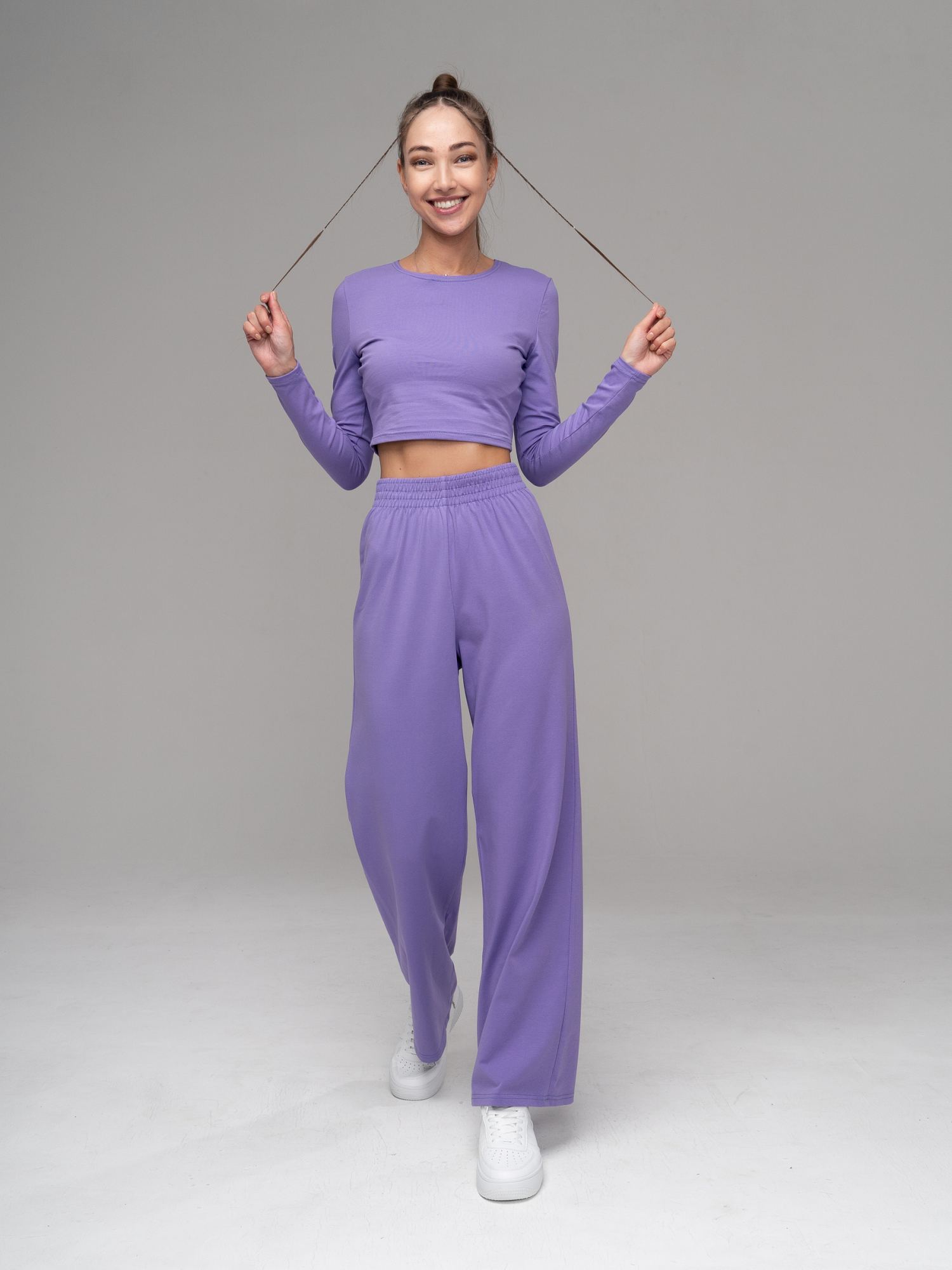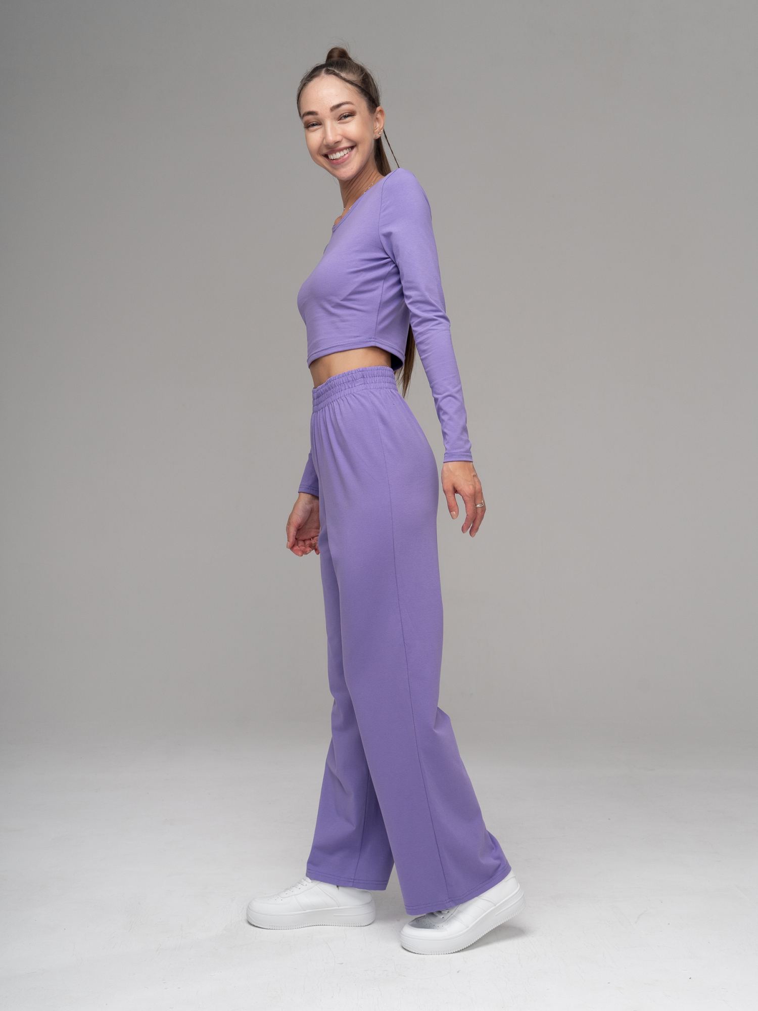 Оригинальный костюм-двойка из кулирки сиреневого цвета . Укороченный кроп с длинными прямыми рукавами и округлой горловиной. Расширенные брюки прямого силуэта с широким цельнокроенным поясом на резинке. Изделие выполнено из трикотажа премиального качества - ПЕНЬЕ, с содержанием хлопка более 95%