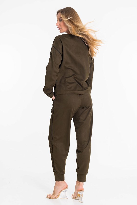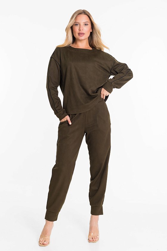 Женский костюм из материала «замша диагональ» состоит из джемпера и брюк, гармонично сочетающихся между собой. Джемпер свободного кроя с длинным рукавом и округлым вырезом горловины обеспечивает удобство и мягко подчеркивает фигуру. Брюки на резинке комфортно сидят по талии, имеют свободный силуэт и универсальную длину, что делает их практичными для повседневной носки. Материал «замша диагональ» приятный на ощупь, мягкий, создаёт ощущение уюта и добавляет образу элегантности. Костюм легко вписывается как в повседневный гардероб, так и в более нарядные комплекты.