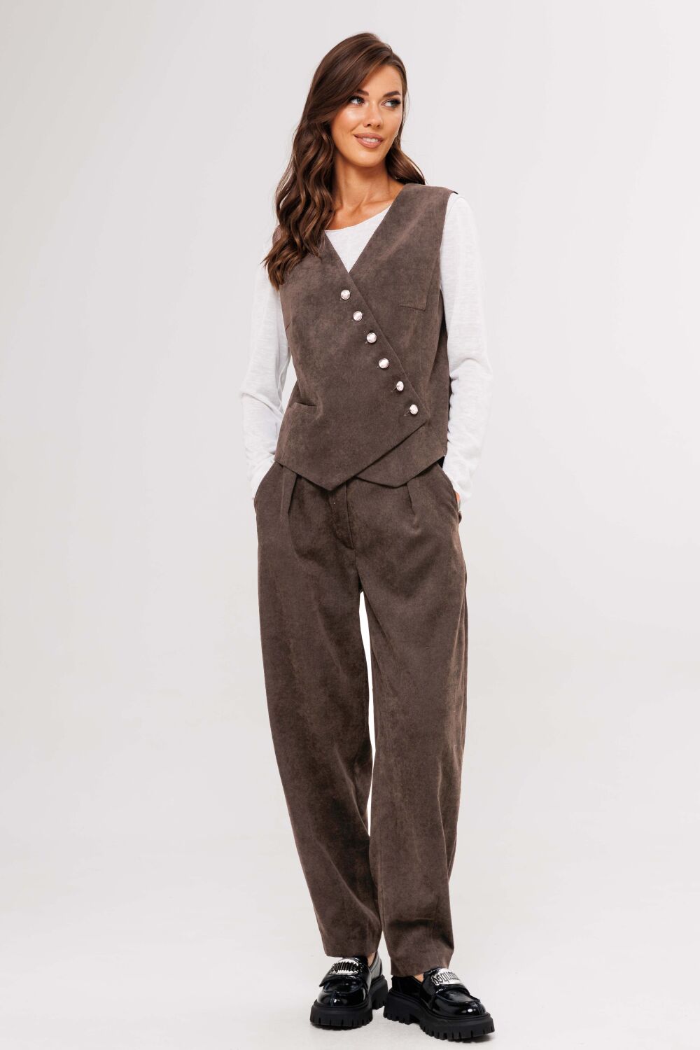 Костюм с жилетом - прекрасное решение для смелых экспериментов.  Жилет полуприлегающего силуэта с асимметричной застёжкой, фигурной линией низа и регулирующийся кулисе по спинке. Полочки с отрезным бочком и нагрудными вытачками, спинки - с центральным швом, отрезным бочком и регулирующийся кулисой с фиксаторами. Брюки "баррел" на притачном поясе со шлёвками (эластичном в области спинки), с наклонными карманами , мягкими складками защипами по верху брюк и вытачками по низу. Джемпер трикотажный, с длинным рукавом, полуприлегающего силуэта.