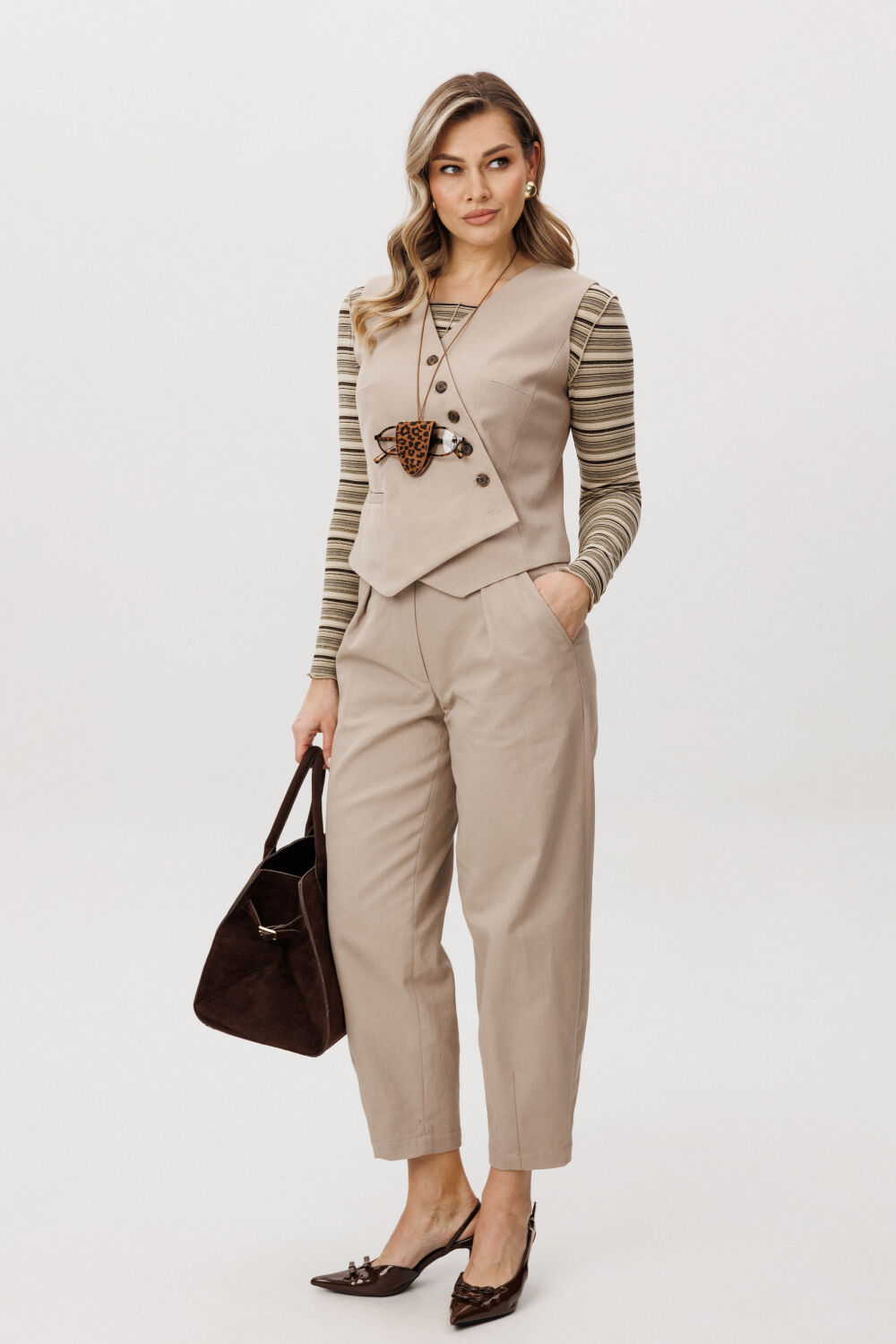 Костюм с жилетом - прекрасное решение для смелых экспериментов.  Жилет полуприлегающего силуэта с асимметричной застёжкой, фигурной линией низа и регулирующийся кулисе по спинке. Полочки с отрезным бочком и нагрудными вытачками, спинки - с центральным швом, отрезным бочком и регулирующийся кулисой с фиксаторами. Брюки "баррел" на притачном поясе со шлёвками (эластичном в области спинки), с наклонными карманами , мягкими складками защипами по верху брюк и вытачками по низу. Джемпер с длинным рукавом, полуприлегающего силуэта.