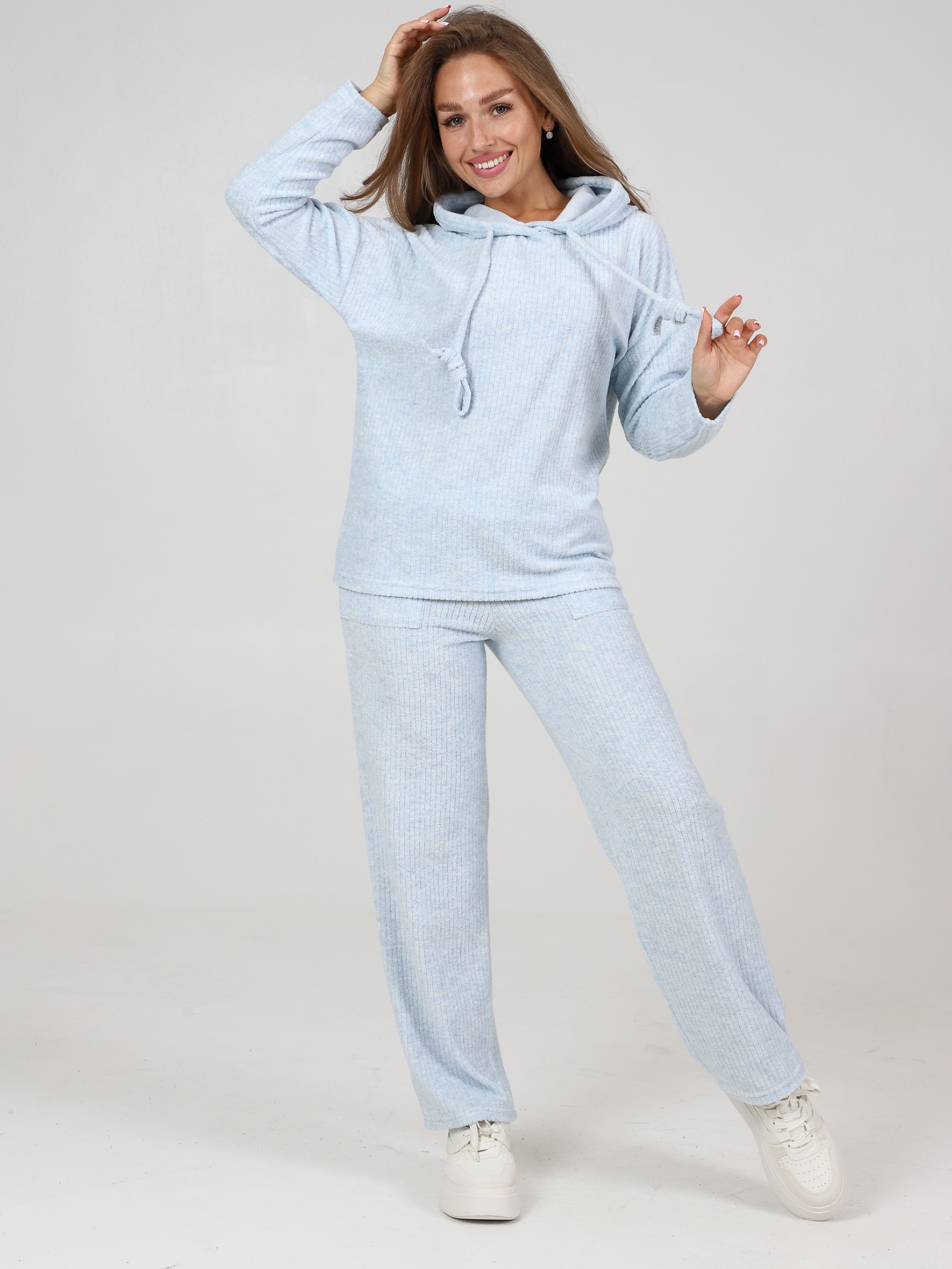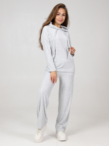 Махровый костюм в рубчик - это великолепное сочетание уюта, тепла и стиля, которое идеально подходит для дома. Костюм состоит из худи свободного кроя с длинным рукавом со спущенным плечом и брюк прямого кроя с карманами.