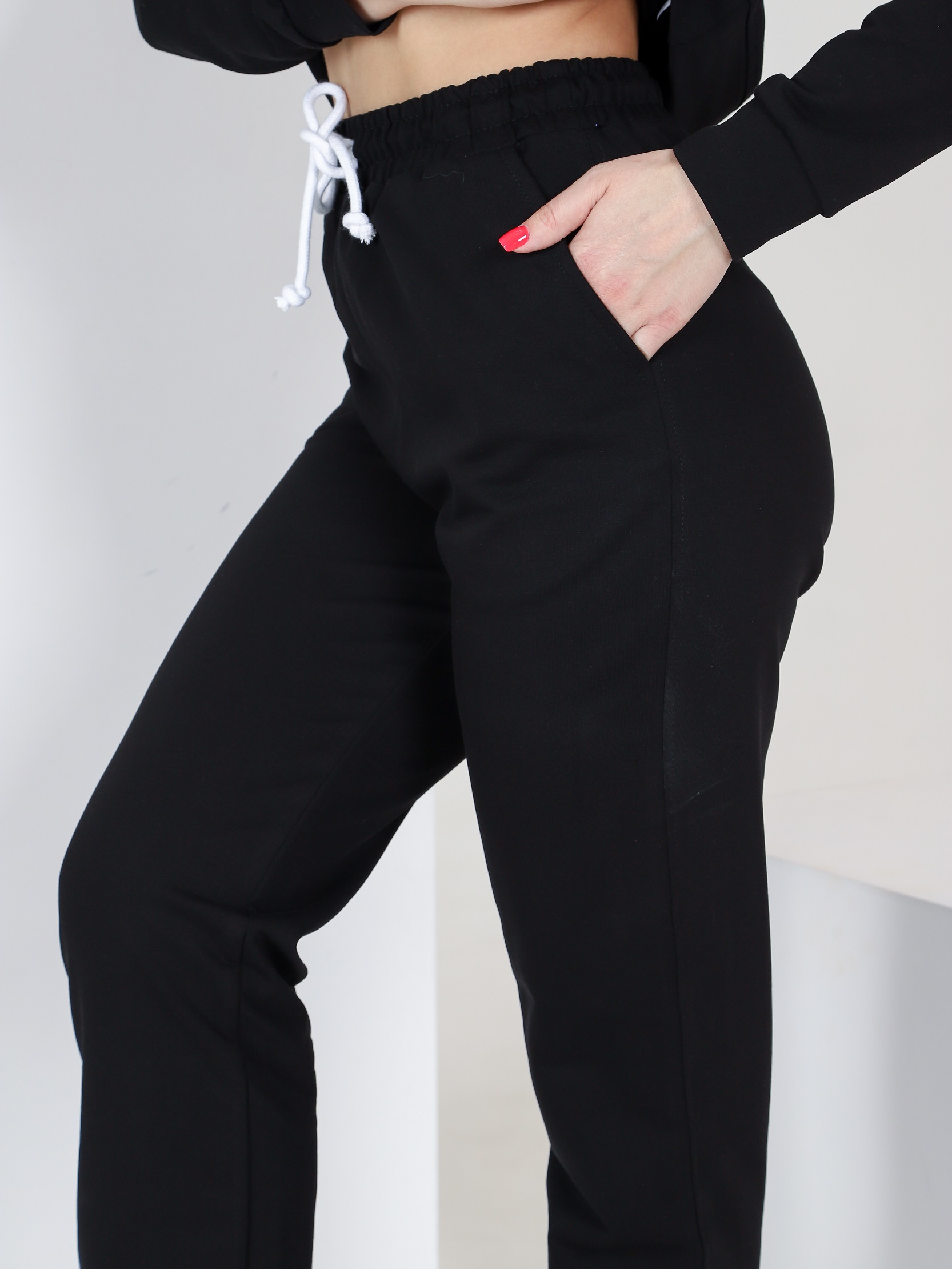 Брюки джоггеры с высокой посадкой и карманами, внизу брючин резинка. Костюм выдержан в спортивном стиле, что позволяет носить его в различных обстоятельствах. Он уместен в кафе, на прогулке в парке или на спортивной площадке.