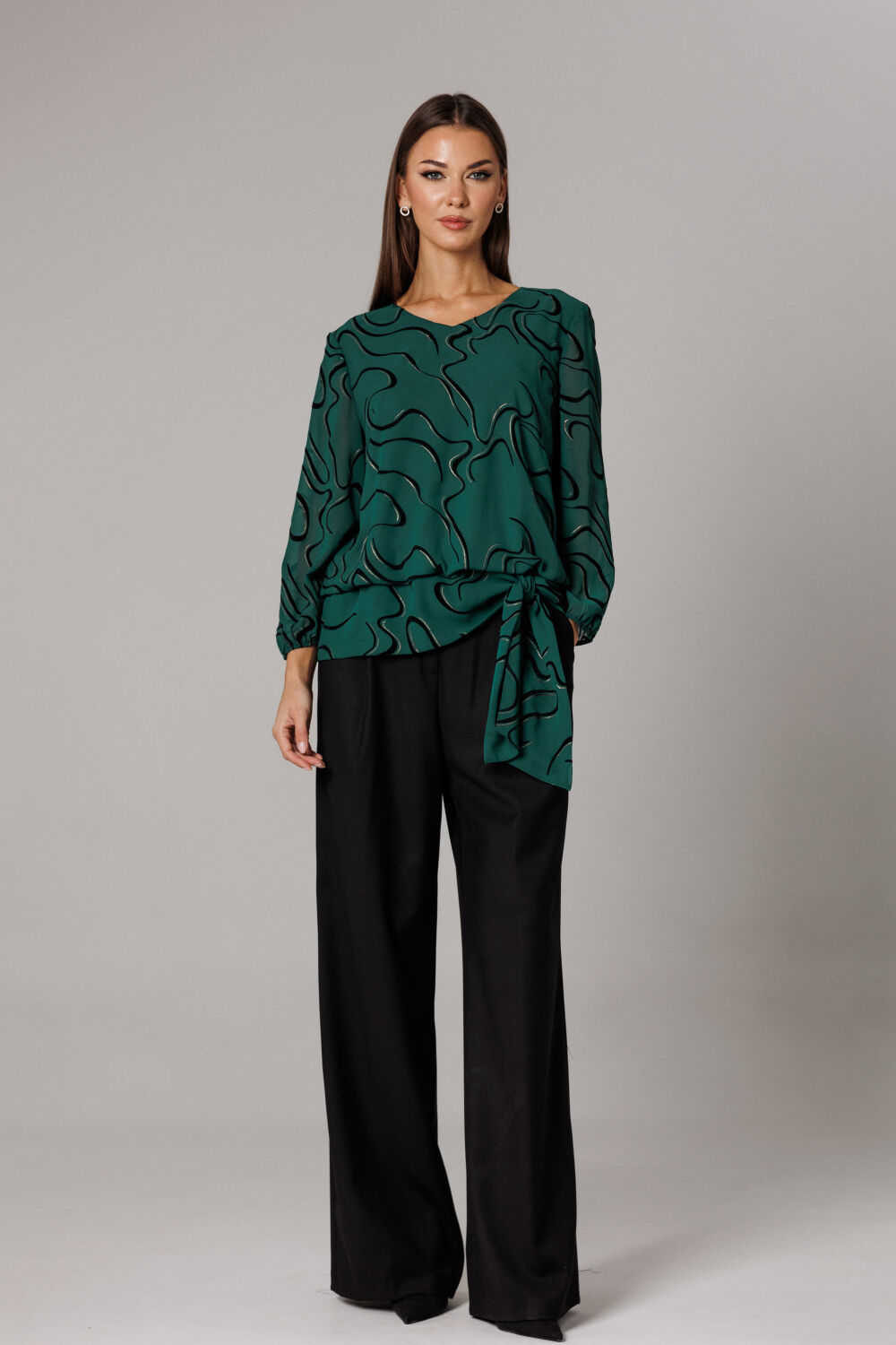 Блуза прямого силуэта на подкладке с ассиметричным притачным поясом-баской, который переходит в ассиметричный спереди завязывающийся узел со свободными концами. Горловина оформлена V-образным вырезом. Рукав втачной, одношовный, длиной 7/8 (51 см). По низу рукава и линии притачного пояса проложена эластичная тесьма для легкой сборки.
