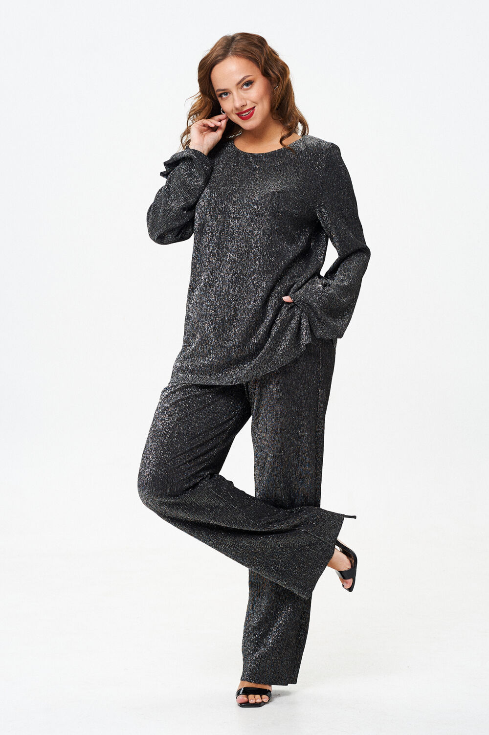 Костюм выполнен из струящейся ткани с люрексом. Блуза свободного силуэта. Горловина округлой формы обработана обтачкой. Рукав втачной, расклешённый к низу. По переду блузы нагрудные выточки, по боковым швам разрезы. Брюки прямого силуэта. Верх брюк на притачном поясе с эластичной тесьмой. В боковых швах карманы с наклонным входом.