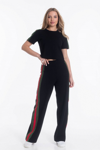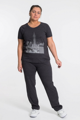 Костюм женский выполнен из кулирки, 100% хлопок. Футболка с круглым вырезом горловины и короткими рукавами покроя реглан. Спереди нанесён оригинальный принт. Брюки с поясом на резинке и накладными карманами.