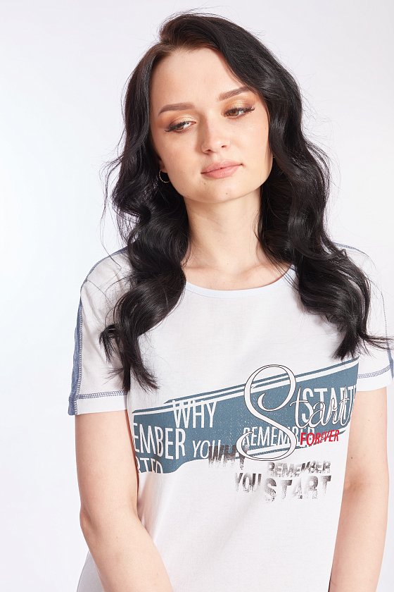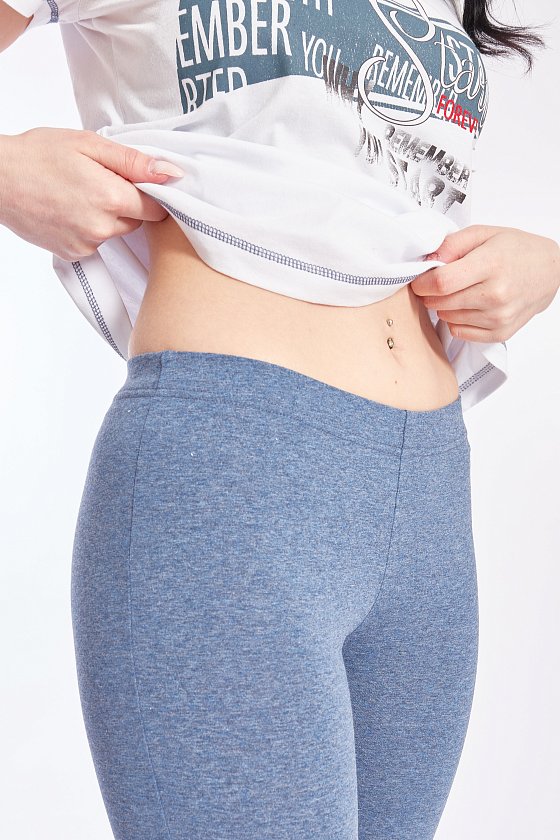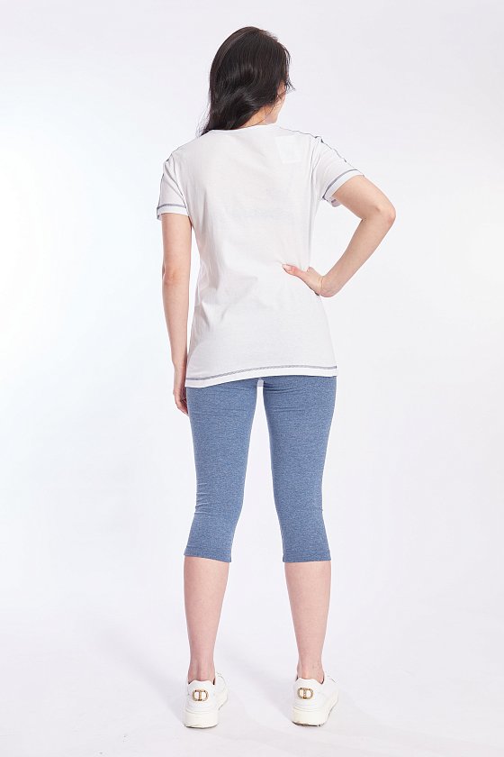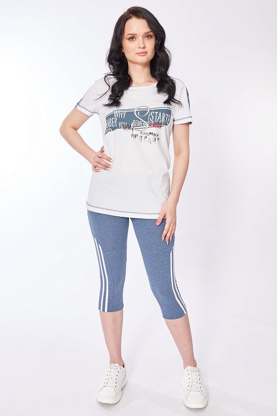 Костюм состоит из бридж и футболки. Бриджи из кулирки с лайкрой, по бокам настрочено по два лампаса. Футболка из кулирки, с круглым вырезом горловины, коротким рукавом и плечевой вставкой контрастного цвета. Спереди футболку украшает принт.