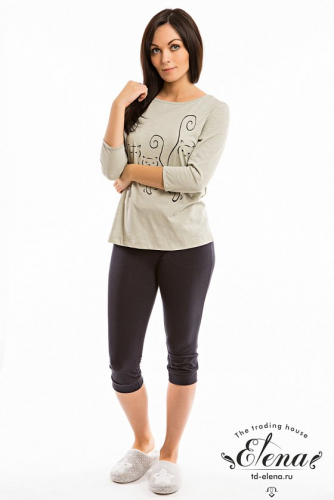 Женский костюм из футер петли с лайкрой. Брюки прямого, зауженого силуэта, по бокам настрочены лампасы. Низ брюк подшит широким подворотом. Пояс на резинке, украшен фальш шнуром. Футболка выполнена из трех полотен. Линия плеча удлинена, манжеты с отворотами. Горловина обработана бейкой из основного полотна.