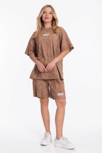 Костюм выполнен из футер петли с лайкрой. Состоит из брюк и толстовки. Толстовка со спущенной линией плеча, рукавом длиной 3/4, в горловине через люверсы проложен шнур. Спереди расположены два кармана, по низу отделка паты. Брюки с резиной на поясе и по низу, по бокам размещены карманы. Детали костюма с отделкой декоративными элементами и репсовой лентой.