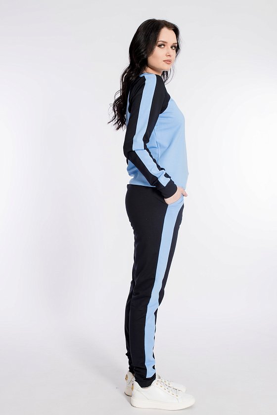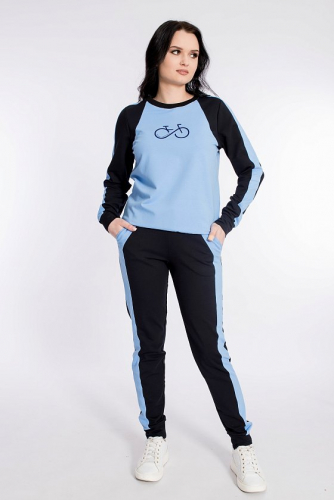 Костюм из однотонного футера с лайкрой, состоит из брюк и толстовки. Толстовка с принтом спереди. Брюки с боковыми карманами, притачным поясом с люверсами и шнуром, внизу с манжетами. На толстовке и брюках вставки из полотна отделочного цвета.