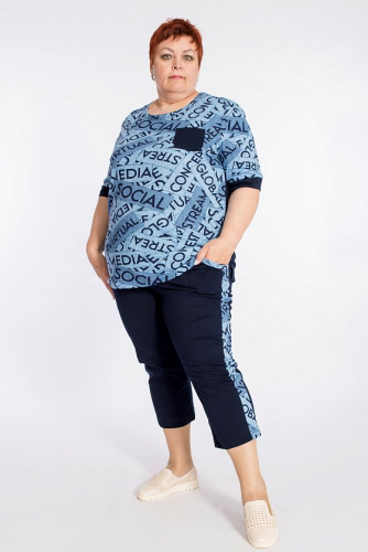 Костюм выполнен из кулирки, 100% хлопок, состоит из футболки и капри. Футболка из полотна с набивным рисунком, с круглым вырезом горловины и нагрудным карманом спереди. Капри однотонные, со вставкой из отделочного полотна и карманами по бокам.