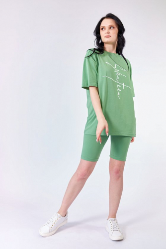 Костюм выполнен из футера трёхнитка "воздушка". Состоит из толстовки с капюшоном, длинные рукава заканчиваются манжетами из основного полотна. Спереди расположен карман-кенгуру. Брюки с поясом на резине, низ манжетах из основного полотна, спереди расположены два накладных кармана. Спереди на толстовке и сзади на брюках нанесён принт.