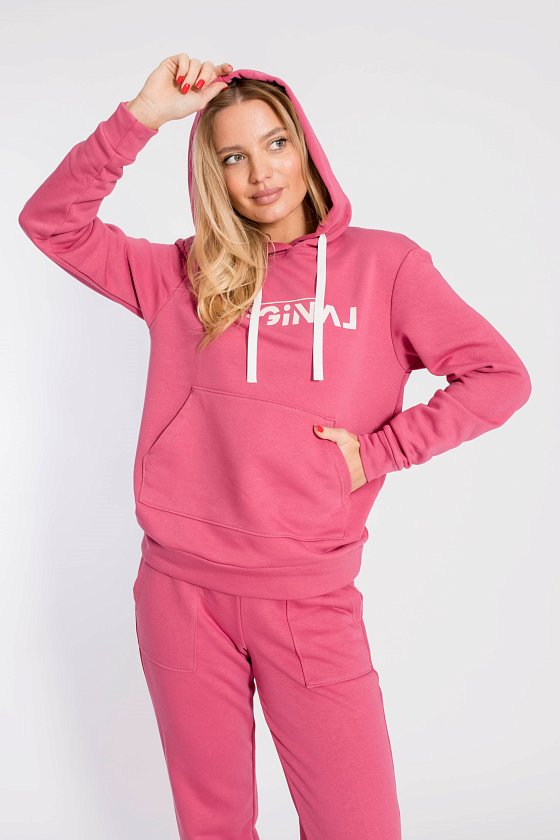 Костюм выполнен из футера трёхнитка "воздушка". Состоит из толстовки с капюшоном, длинные рукава заканчиваются манжетами из основного полотна. Спереди расположен карман-кенгуру. Брюки с поясом на резине, низ манжетах из основного полотна, спереди расположены два накладных кармана. Спереди на толстовке и сзади на брюках нанесён принт.