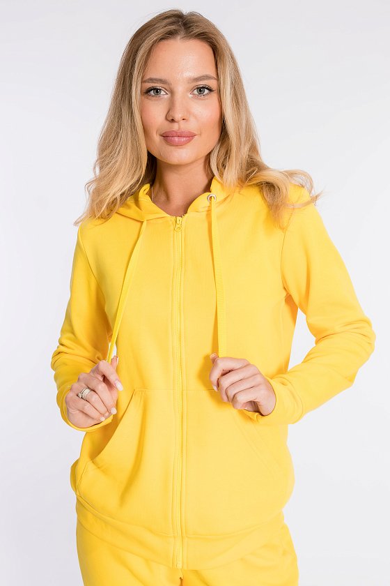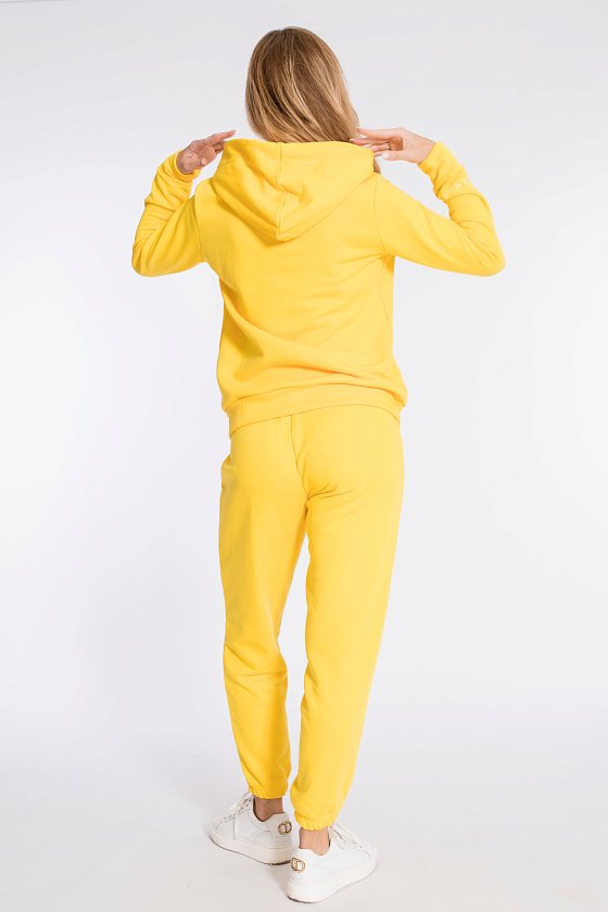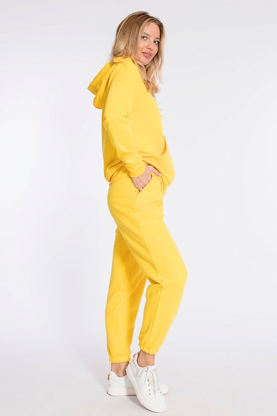 Костюм выполнен из однотонного футера "воздушки". Толстовка с капюшоном, застежкой на молнию и карманами кенгуру. На правом рукаве вышивка. Брюки с боковыми карманами и притачным поясом, низ на резинке. Сверху на брюках размещена вышивка.