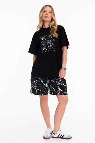 Костюм выполнен из х/б полотна. Футболка с коротким спущенным рукавом, крой прямой, свободный, по бокам разрезы. Горловина имеет круглый вырез. Капри с карманами, по бокам внизу небольшие разрезы.