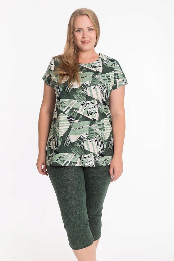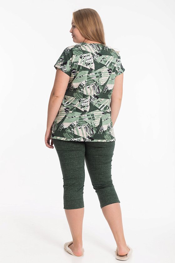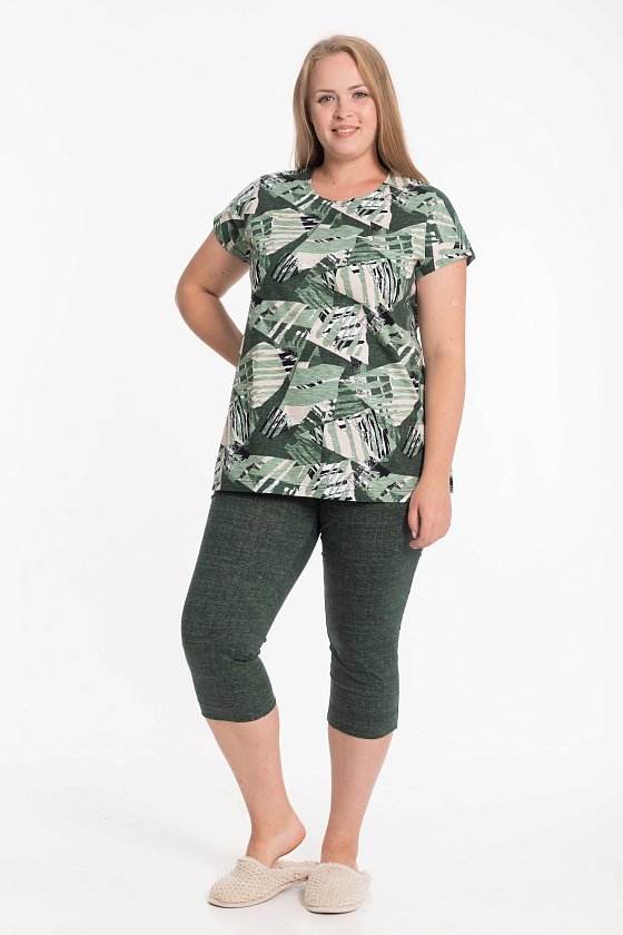 Костюм выполнен из х/б полотна. Футболка с коротким спущенным рукавом, крой прямой, свободный, по бокам разрезы. Горловина имеет круглый вырез. Капри с карманами, по бокам внизу небольшие разрезы.