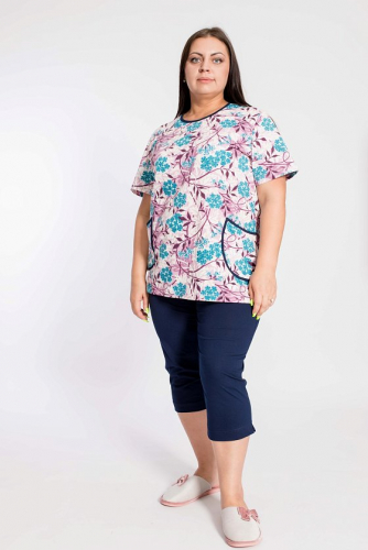 Костюм из кулирки. Футболка однотонная, с круглым вырезом горловины, спереди расположен принт. Втачной рукав длиной 3/4. Брюки на резинке сверху и снизу, с боковыми карманами.