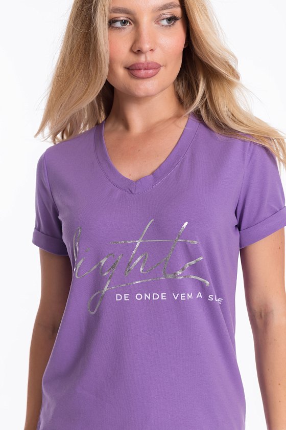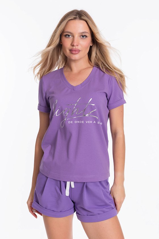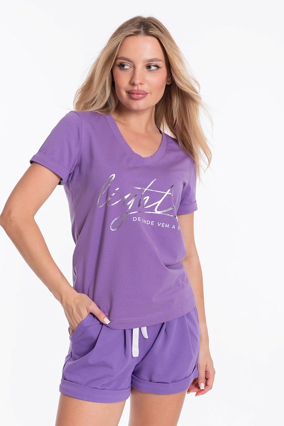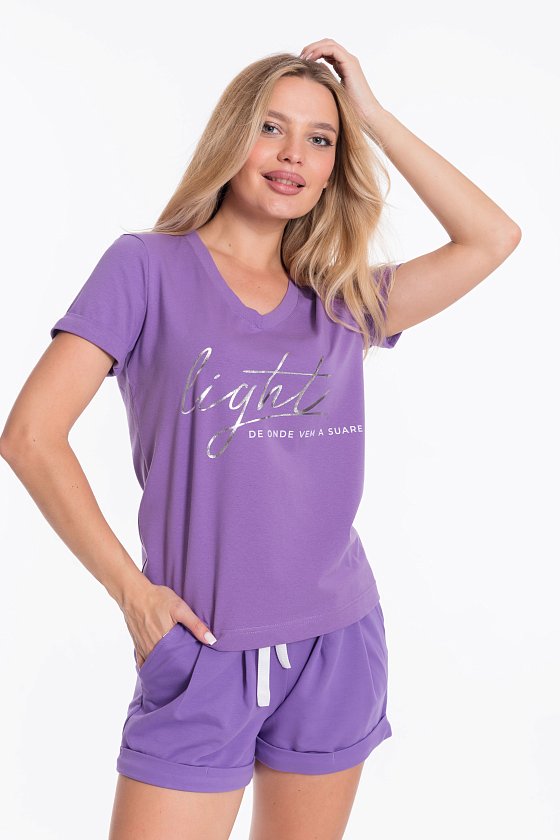 Женский костюм - футболка и шорты, выполнен из комбинации двух видов полотна. Футболка из мягкой и эластичной кулирки с лайкрой обеспечивает свободу движений, а V-образный вырез горловины с планкой придаёт изделию аккуратный вид. Рукава футболки и штанины шорт с отворотами, спереди нанесён интересный принт.