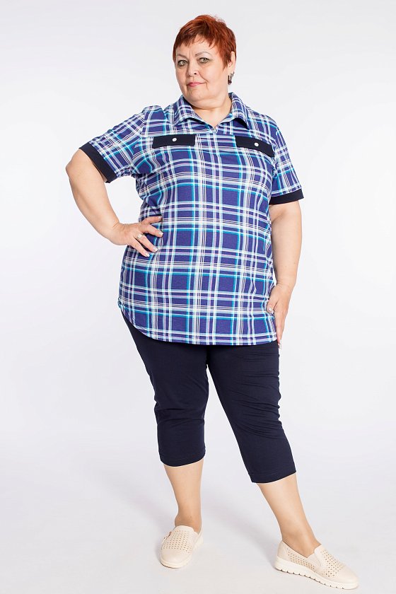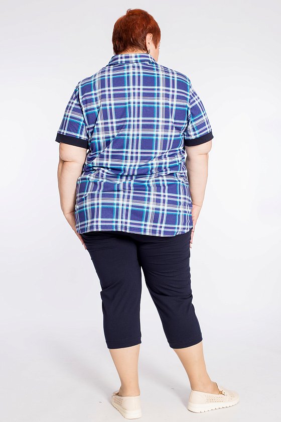 Женский костюм выполнен из кулирки, состоит из футболки с воротником и капри. Капри однотонные, с поясом на резинке. Футболка с рисунком в клетку с однотонной отделкой клапанами спереди и на рукавах.