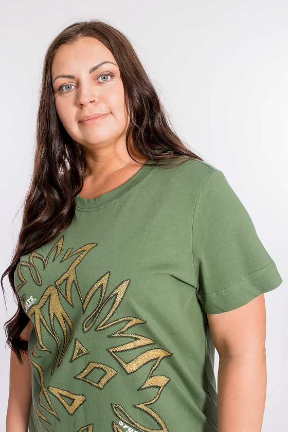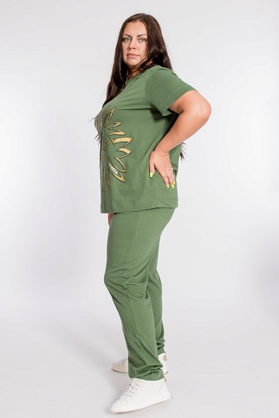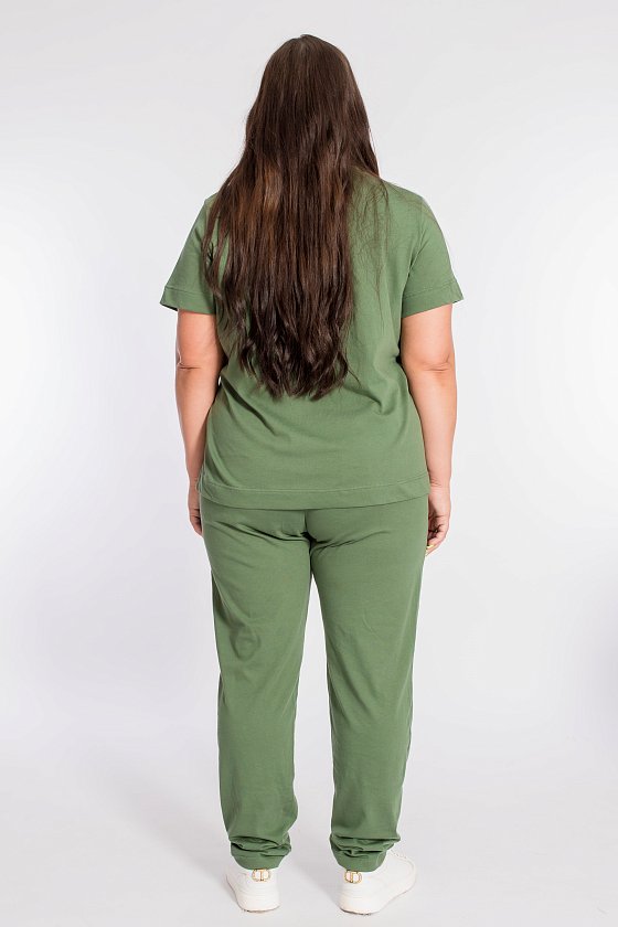 Женский костюм выполнен из хлопкового полотна, состоит из брюк и футболки. Брюки с боковыми карманами и притачным поясом на резинке. Футболка с коротким рукавом и овальным вырезом горловины, обработанным планкой. Спереди на футболке принт.