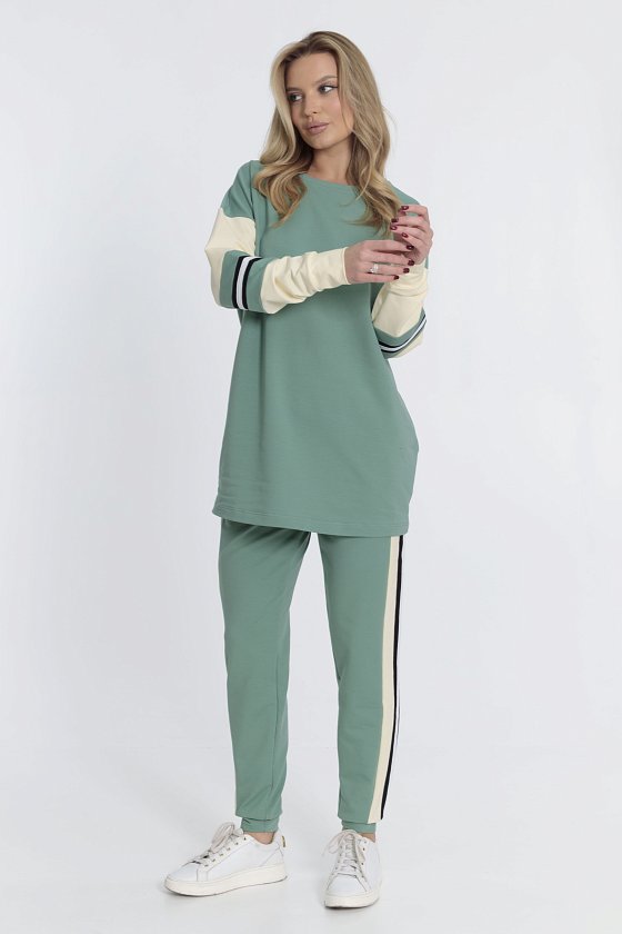 Костюм выполнен из футер петли с лайкрой. Толстовка свободная, удлинённого силуэта, линия плеча спущена. Длинные рукава заканчиваются манжетами, круглый вырез горловины оформлен планкой. Брюки с притачным поясом, манжетами и боковыми карманами. На рукавах толстовки и на брюках отделочные полосы с лампасами.