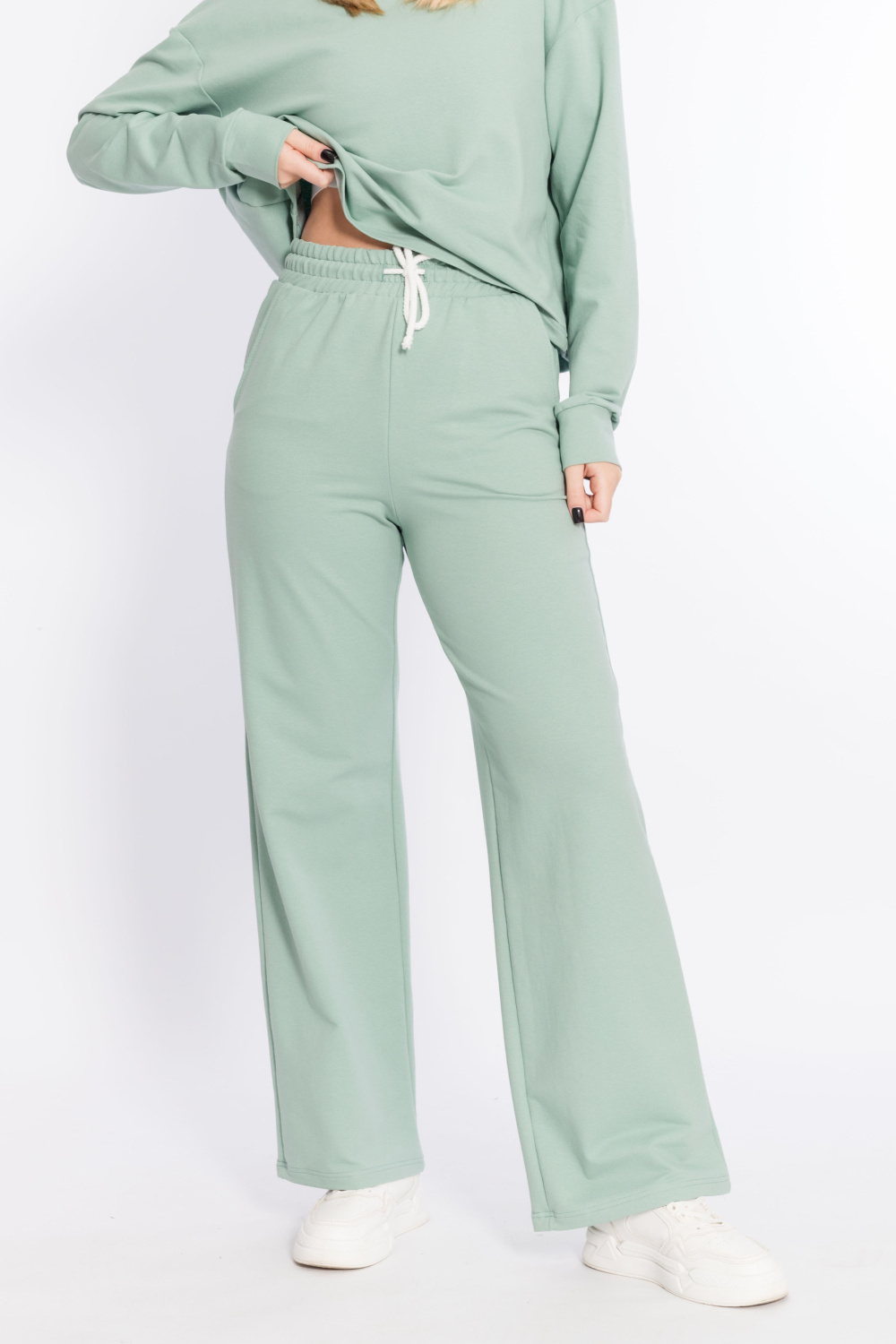 Женский костюм выполнен из однотонного футера с лайкрой. Толстовка укороченная, со спущенной линией плеча, прямого свободного силуэта. С капюшоном и длинным рукавом на манжете. Брюки свободные прямые, с боковыми карманами и притачным поясом на резине и шнуре. Хлопок 95% Лайкра 5%