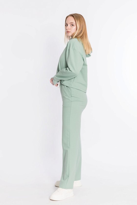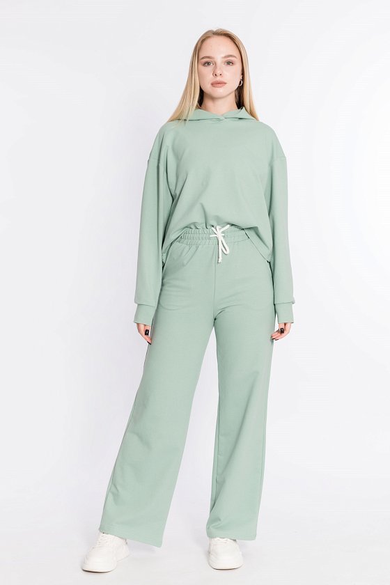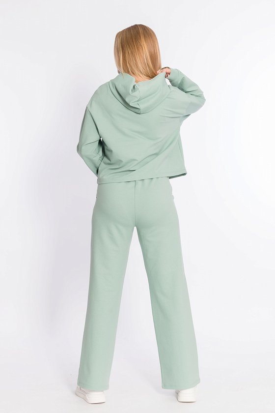 Женский костюм выполнен из однотонного футера с лайкрой. Толстовка укороченная, со спущенной линией плеча, прямого свободного силуэта. С капюшоном и длинным рукавом на манжете. Брюки свободные прямые, с боковыми карманами и притачным поясом на резине и шнуре.
