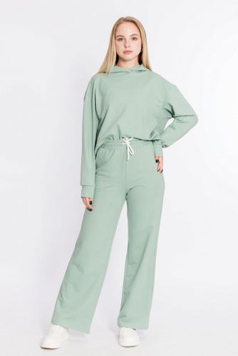 Женский костюм выполнен из однотонного полотна с начёсом. Толстовка удлинённая, cо спущенной линией плеча и капюшоном со шнуром. Спереди на толстовке нанесён принт. Брюки с карманами по бокам, низ на резине. Пояс на резине и шнуре.
