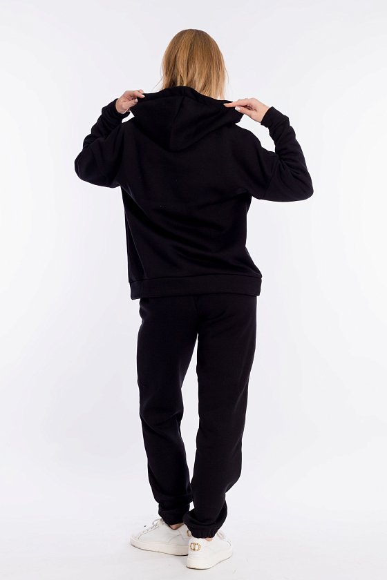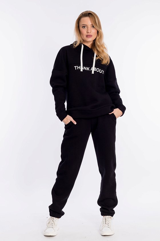 Женский костюм выполнен из однотонного полотна с начёсом. Толстовка удлинённая, cо спущенной линией плеча и капюшоном со шнуром. Спереди на толстовке нанесён принт. Брюки с карманами по бокам, низ на резине. Пояс на резине и шнуре.