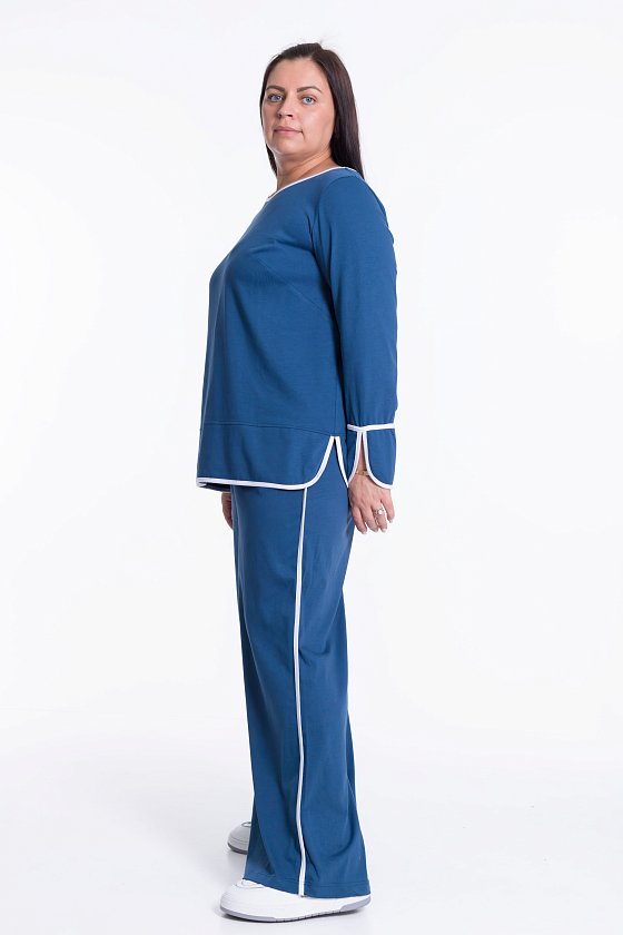 Декоративные элементы костюма - срезы по низу блузки и карманов, обработанные бейкой контрастного цвета. Брюки с боковыми карманами и поясом на резинке, широкие по всей длине. Блуза свободная с круглым вырезом горловины.