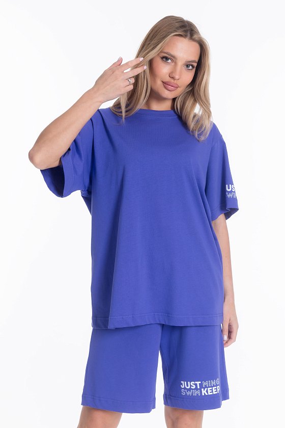 Костюм из хлопка. Футболка - оверсайз, круглый вырез горловины, спущенный рукав. Шорты - свободный крой, удлиненные, боковые карманы, пояс на резинке. На правом рукаве футболки и слева на шортах принт