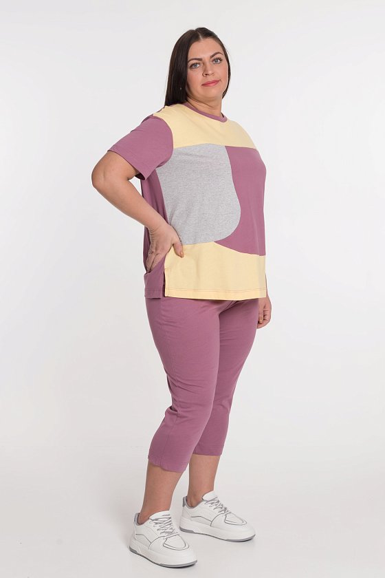 Футболка - три цвета полотна, круглый вырез горловины отделан бейкой, разрезы по бокам.