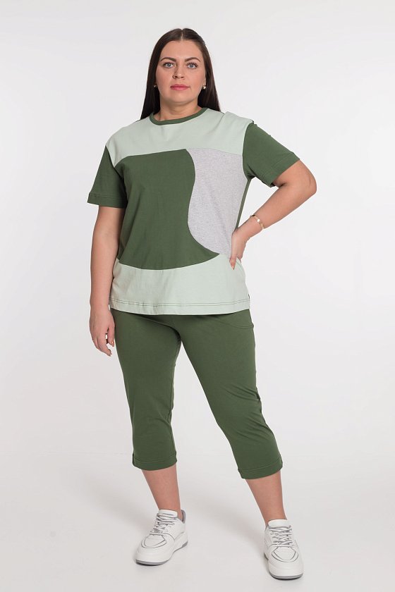 Футболка - три цвета полотна, круглый вырез горловины отделан бейкой, разрезы по бокам.