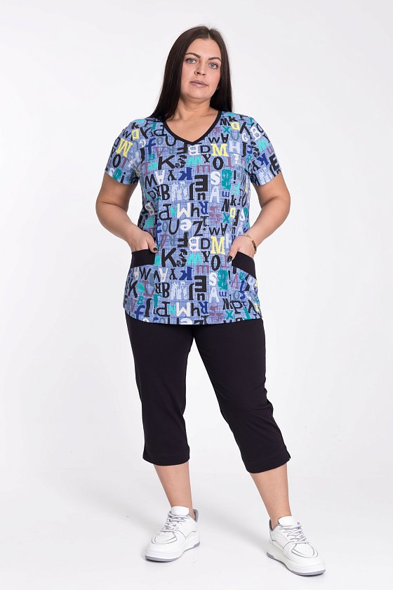 Женский костюм — отличный выбор для повседневной носки. Он состоит из футболки и капри, выполненных из мягкой и приятной к телу ткани — кулирки.