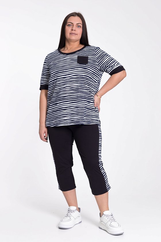 Капри имеют одноцветный дизайн с лампасами в цвет основного полотна футболки. Это придаёт модели оригинальность и делает её более стильной.