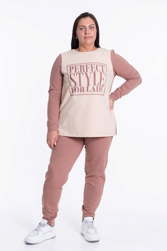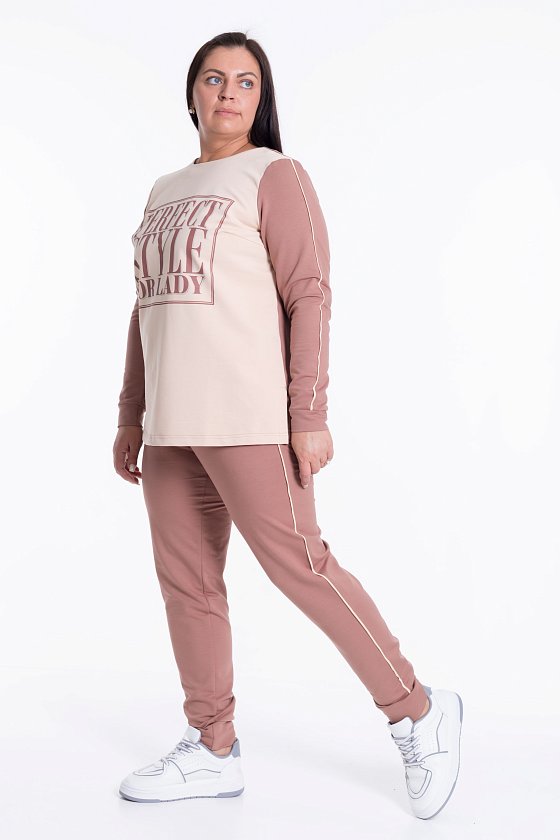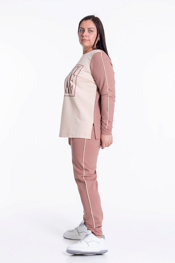 Костюм из полотна футер петля с лайкрой. Футболка - на полочке принт, по бокам разрезы. Брюки с боковыми карманами и поясом на резинке. На рукавах футболки и по боковым швам брюк проложен кант в цвет отделки.