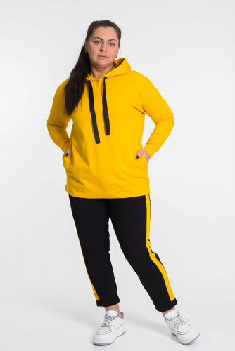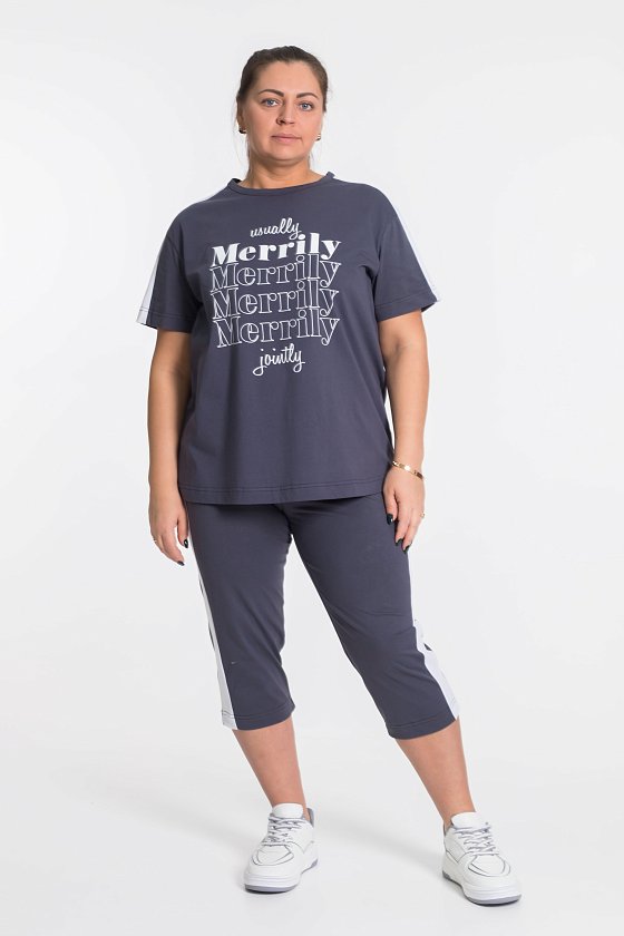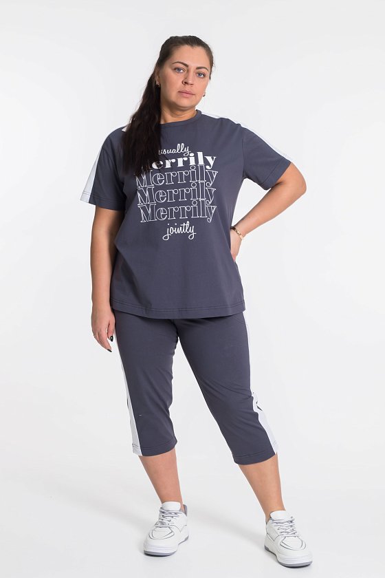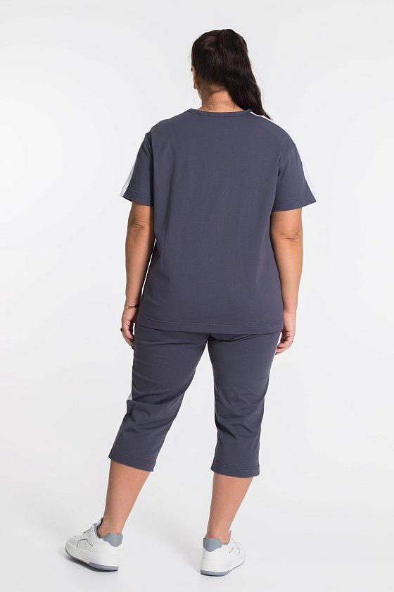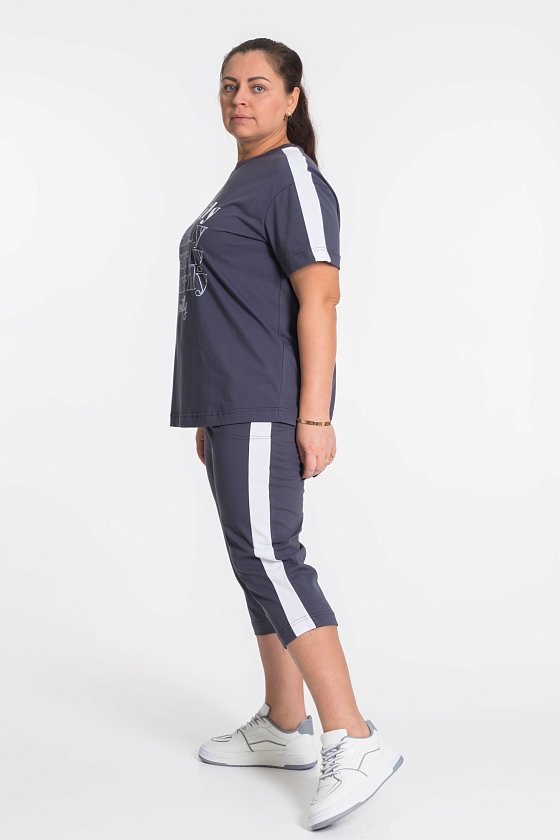 По плечам и рукаву футболки, по бокам капри лампасы контрастного цвета.