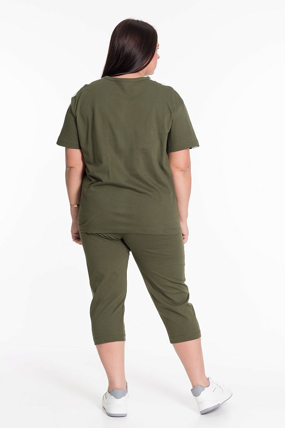 По плечам и рукаву футболки, по бокам капри лампасы контрастного цвета.