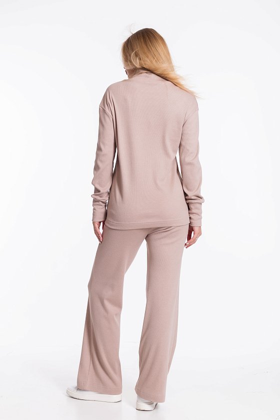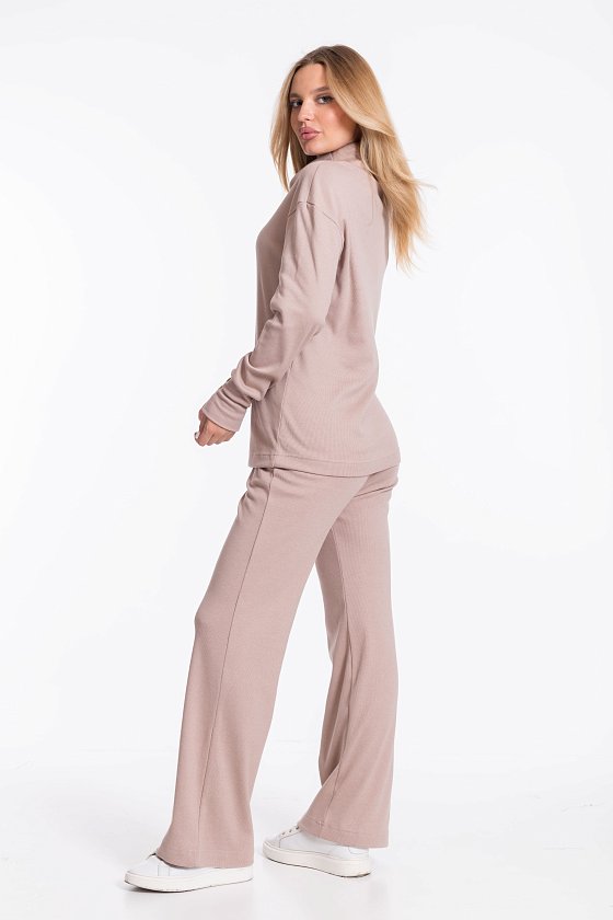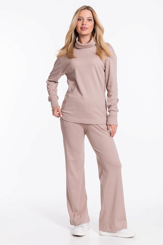 Женский однотонный бежевый костюм из кашкорсе — отличный выбор для повседневной носки. Водолазка с воротником-стойкой, спущенной линией плеча и удлинёнными манжетами на рукавах создают элегантный образ. Брюки свободного силуэта хорошо садятся по фигуре, а боковые карманы добавляют практичности. Широкий пояс на резинке обеспечивает комфортную посадку.