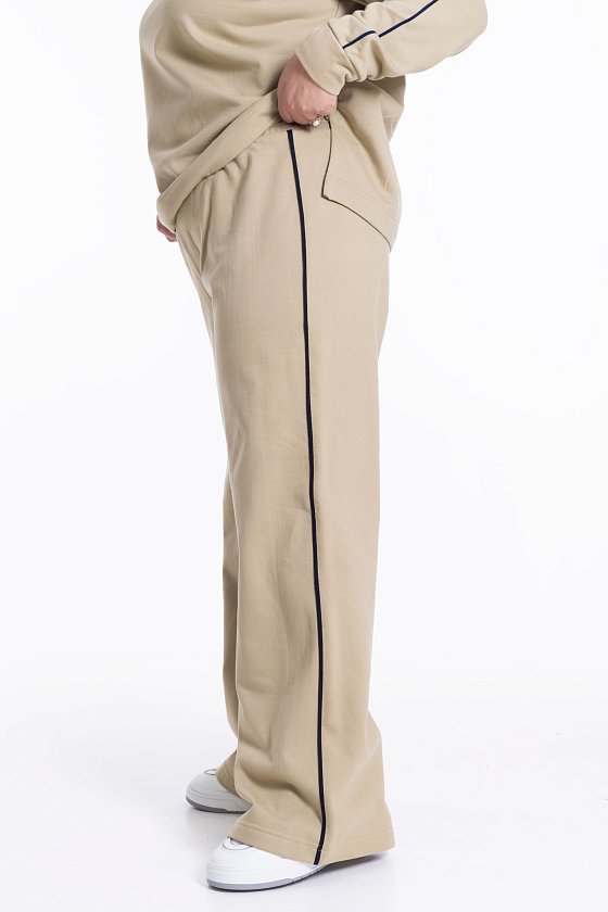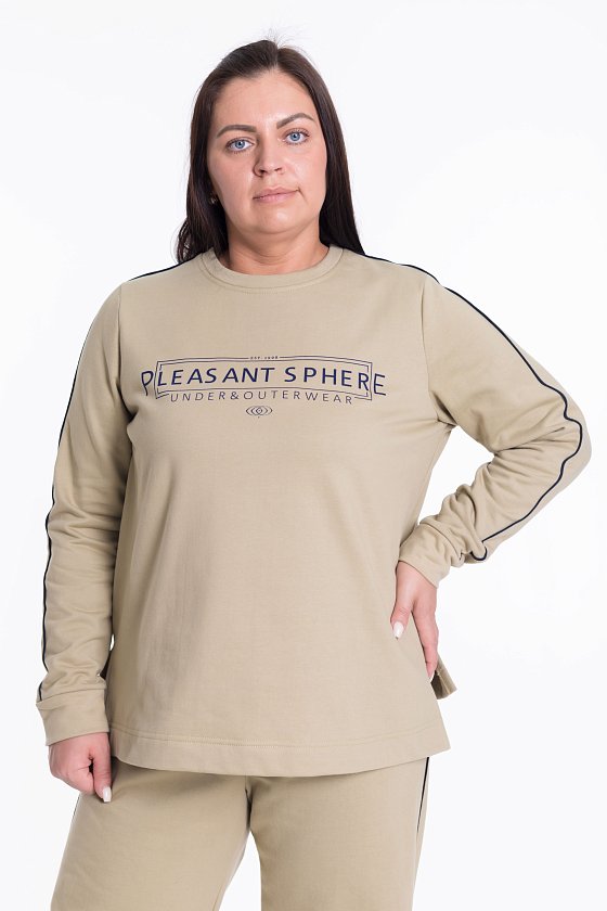 Тёплый и стильный женский костюм из футера с начёсом — отличный выбор для повседневной носки. Кант контрастного цвета, проходящий по рукавам и боковому шву брюк, придаёт изделию оригинальность. Толстовка с принтом спереди и разрезами по бокам обеспечивает свободу движений. Костюм идеально подойдёт для прохладных дней.