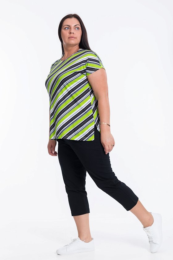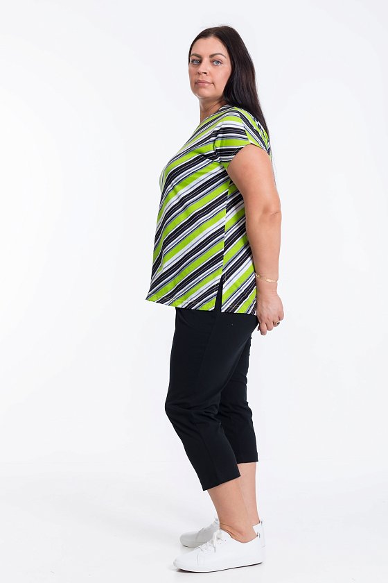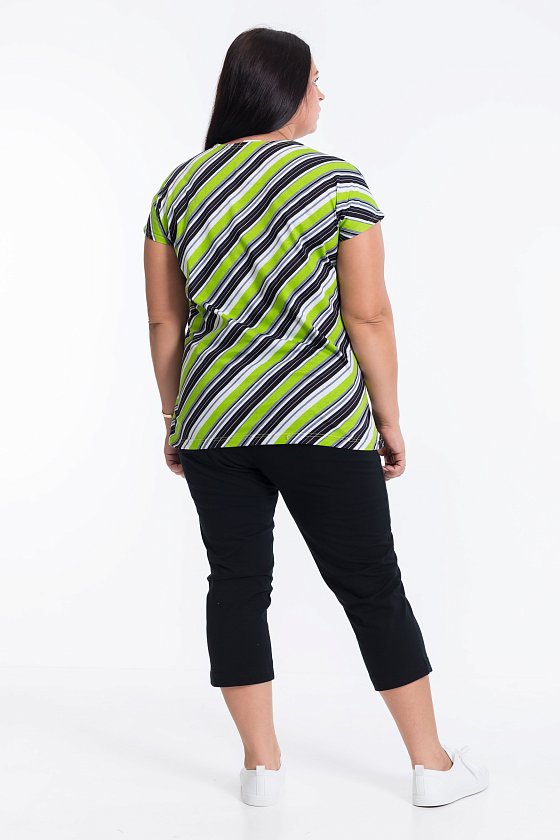 Женский костюм из кулирки — отличный выбор для повседневной носки. Футболка с ярким полосатым узором, спущенными рукавами и круглым вырезом украшена разрезами по бокам, что обеспечивает свободу движений. Однотонные капри гармонично дополняют образ. Этот яркий, современный дизайн одежды привлекает внимание своей смелой цветовой гаммой и геометрическим узором. Сочетание лаймового зеленого с черным, серым и белым создает энергичный и стильный образ. Изготовленный из натуральной ткани, костюм обеспечит комфорт в течение всего дня.