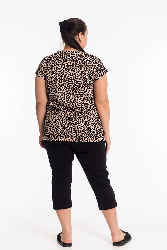 Женский костюм из кулирки — отличный выбор для повседневной носки. Футболка с набивкой "леопард", спущенными рукавами и круглым вырезом горловины украшена разрезами по бокам, что обеспечивает свободу движений. Однотонные капри гармонично дополняют образ. Этот яркий, современный дизайн одежды привлекает внимание своей смелой цветовой гаммой и создает энергичный и стильный образ. Изготовленный из натуральной ткани, костюм обеспечит комфорт в течение всего дня.