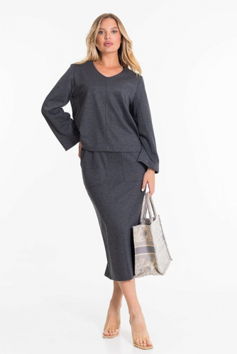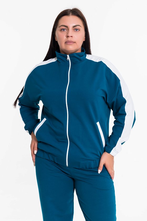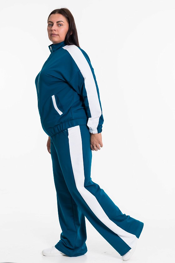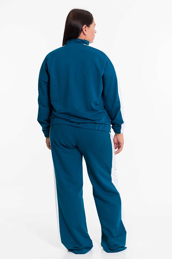 Костюм выполнен из футерного полотна, состоит из свободных по ширине низа брюк и толстовки со спущенной линией плеча. Низ рукавов и толстовки на резинке. Воротник стойка, по центру застежка на молнию. Брюки с карманами по бокам, в пояс вставлена резинка.