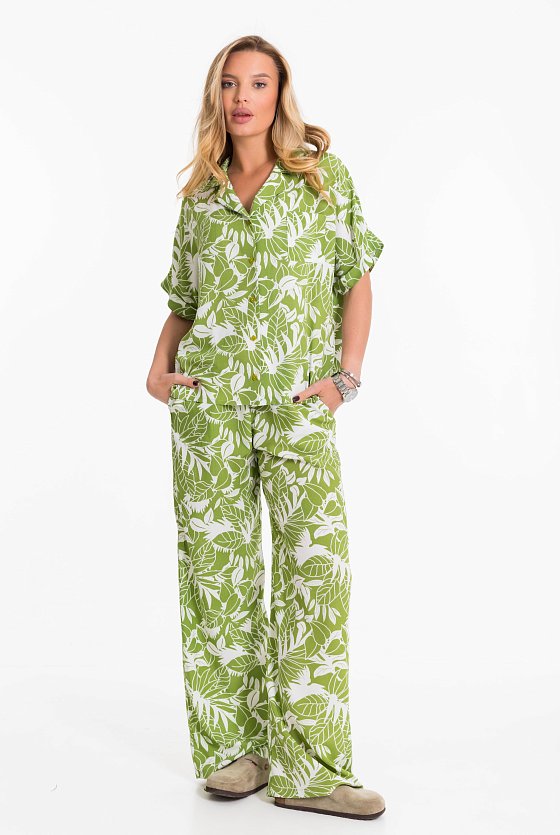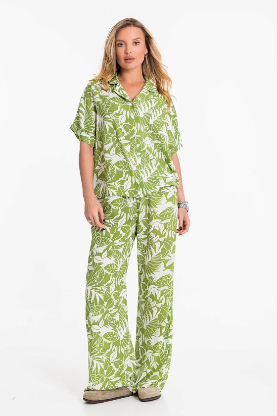 Костюм выполнен из лёгкого и приятного к телу штапельного полотна с набивным рисунком. В комплект входят рубашка и брюки. Рубашка свободного фасона (оверсайз), с цельнокроеными рукавами длиной чуть выше локтя и аккуратными отложными манжетами. На спинке — застроченная бантовая складка, обеспечивающая дополнительную свободу движений. Застёжка на пуговицы, отложной воротник и накладной карман на груди завершают образ. Брюки прямого свободного кроя с комфортным притачным поясом и регулирующим шнуром. По бокам — удобные карманы. Этот комплект — универсальный выбор для прогулок, работы и отдыха. Лёгкость ткани и продуманный крой обеспечат максимальный комфорт в течение всего дня.