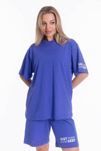 Женский костюм из хлопкового полотна — отличный выбор для повседневной носки. Костюм состоит из футболки и брюк, выполненных из мягкой и приятной к телу ткани. Футболка из кулирки с лайкрой, со спущенной линией плеча, что придаёт модели свободный и расслабленный вид. Рукав доходит до локтя, обеспечивая удобство и свободу движений. По бокам внизу расположены небольшие разрезы, а спереди — принт, который гармонирует с цветом брюк. Брюки из футера, прямого кроя оснащены карманами и поясом на резинке, что делает модель более функциональной и удобной. Низ брюк подвернут, это придает изделию оригинальность. Такой костюм идеально подойдёт для прогулок, неформальных встреч или отдыха.