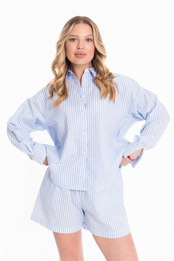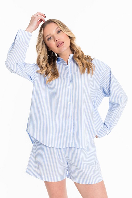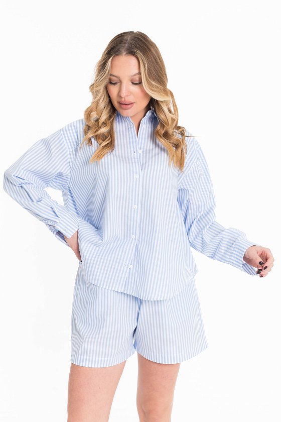 Костюм из хлопковой рубашечной ткани в вертикальную полоску. Шорты свободного покроя, с боковыми карманами. Рубашка - легкий оверсайз, с длинным рукавом и застёжкой на пуговицы, воротник на отрезной стойке. Перед рубашки короче спинки, низ фигурный.