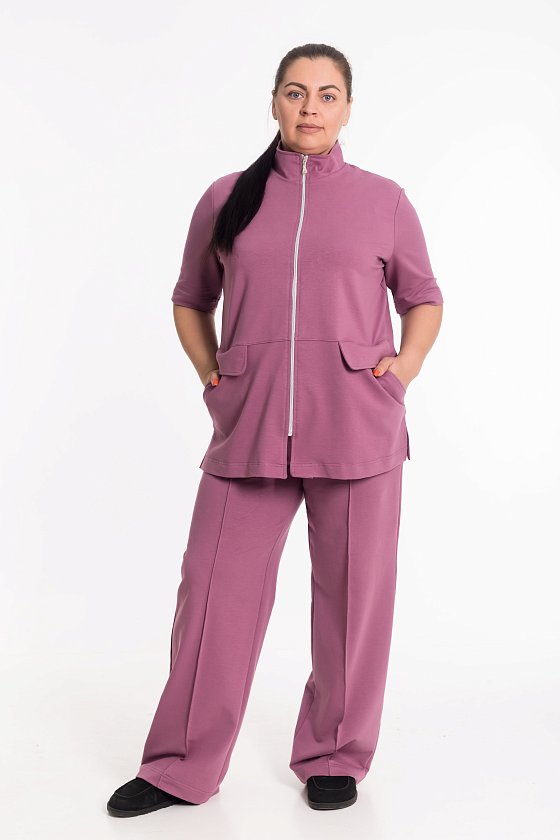Женский костюм выполнен из однотонного футера с лайкрой и состоит из брюк и рубашки на молнии. Брюки имеют удобный притачной пояс и боковые карманы. Рубашка с воротником-стойкой дополнена горизонтальным подрезом на полочках, от которого начинаются боковые карманы с клапанами. В боковых швах предусмотрены разрезы для комфорта. Рукава длиной до локтя делают образ стильным и практичным.